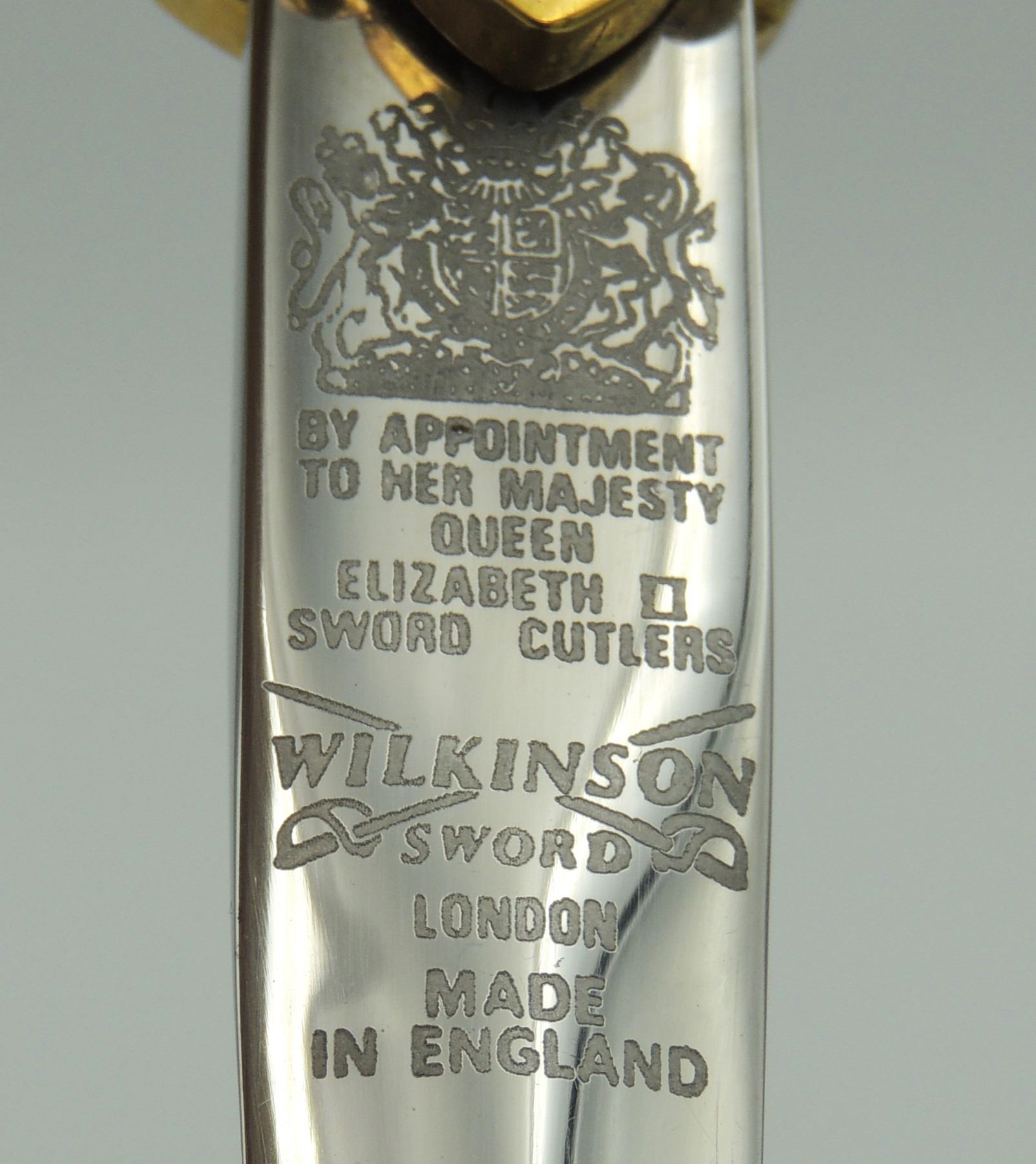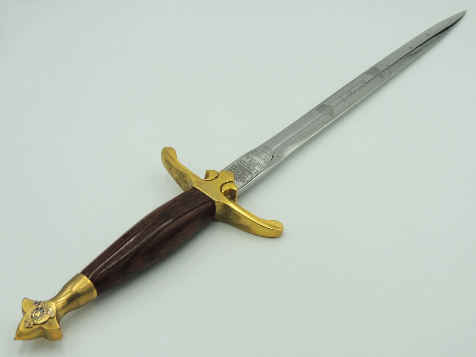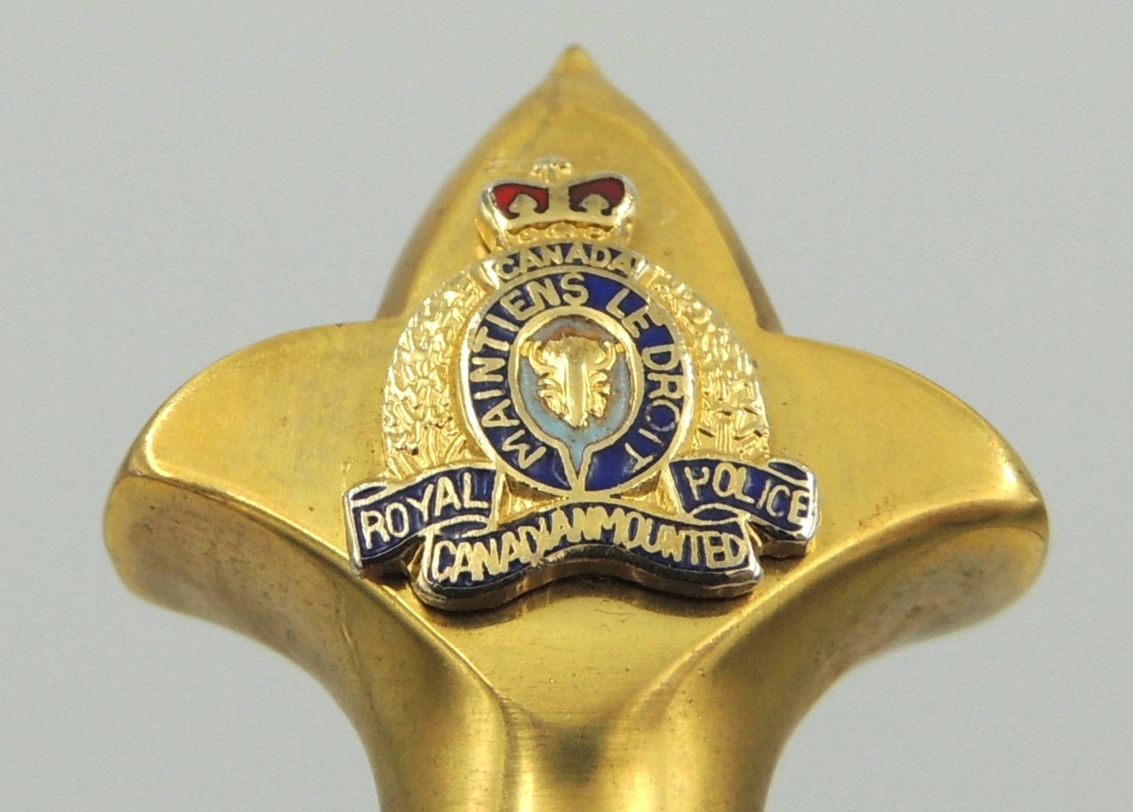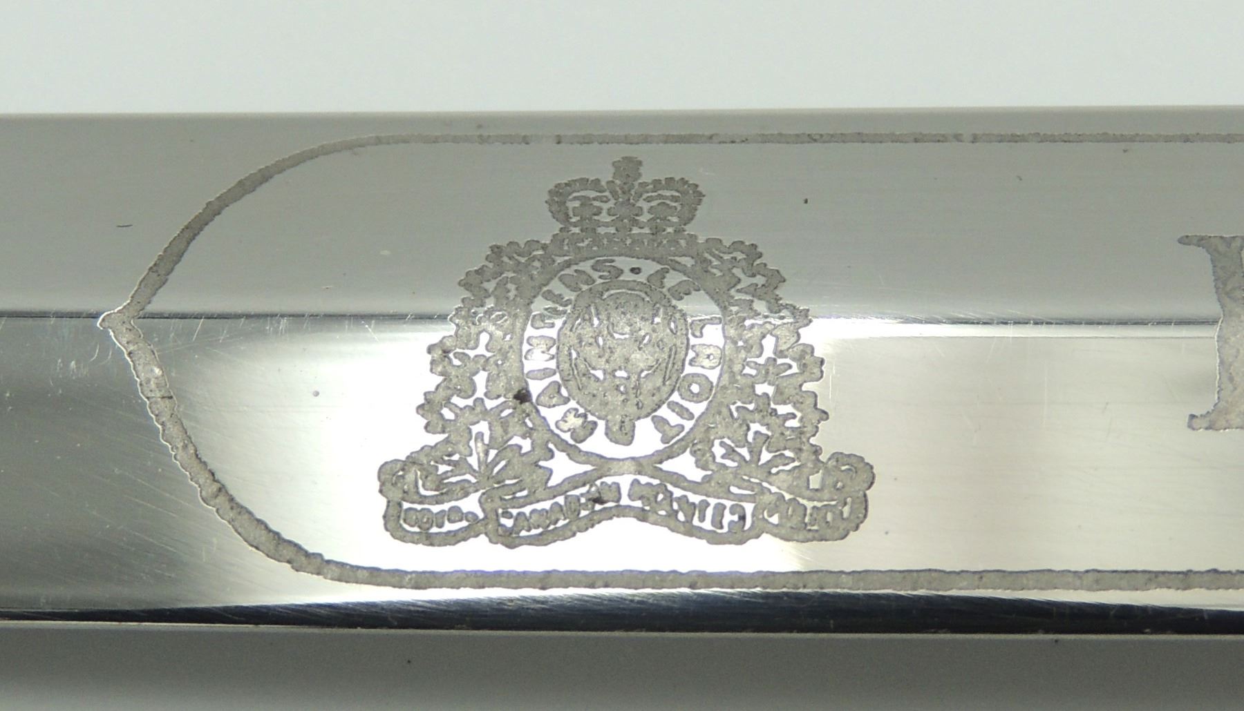 Commemorative Royal Canadian Mounted Police Blade / Dagger.With North West Mounted Police & Queens Crown Royal Canadian Mounted Police Badge Design and center "R.C.M.P." on one side of blade. Seldom Seen, Manufactured by Wilkinson Sword (By Appointment to Her Majesty Queen Elizabeth II Sword Cutters) London, Made in England. Canadian Law Enforcement