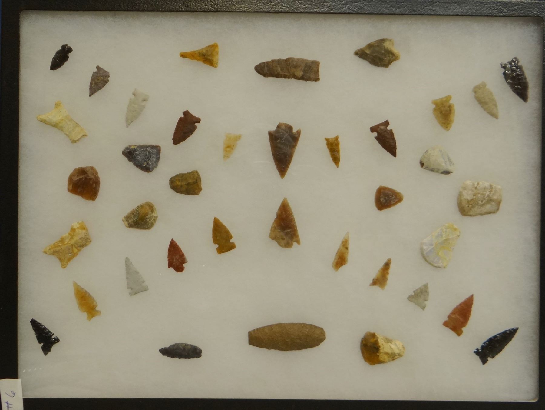 38 artifacts in 12”x 16”x1” frame, includes 9 scrapers, 4 awls, 3 knives, 22 arrowheads, Knife River flint, Pelican Lake points