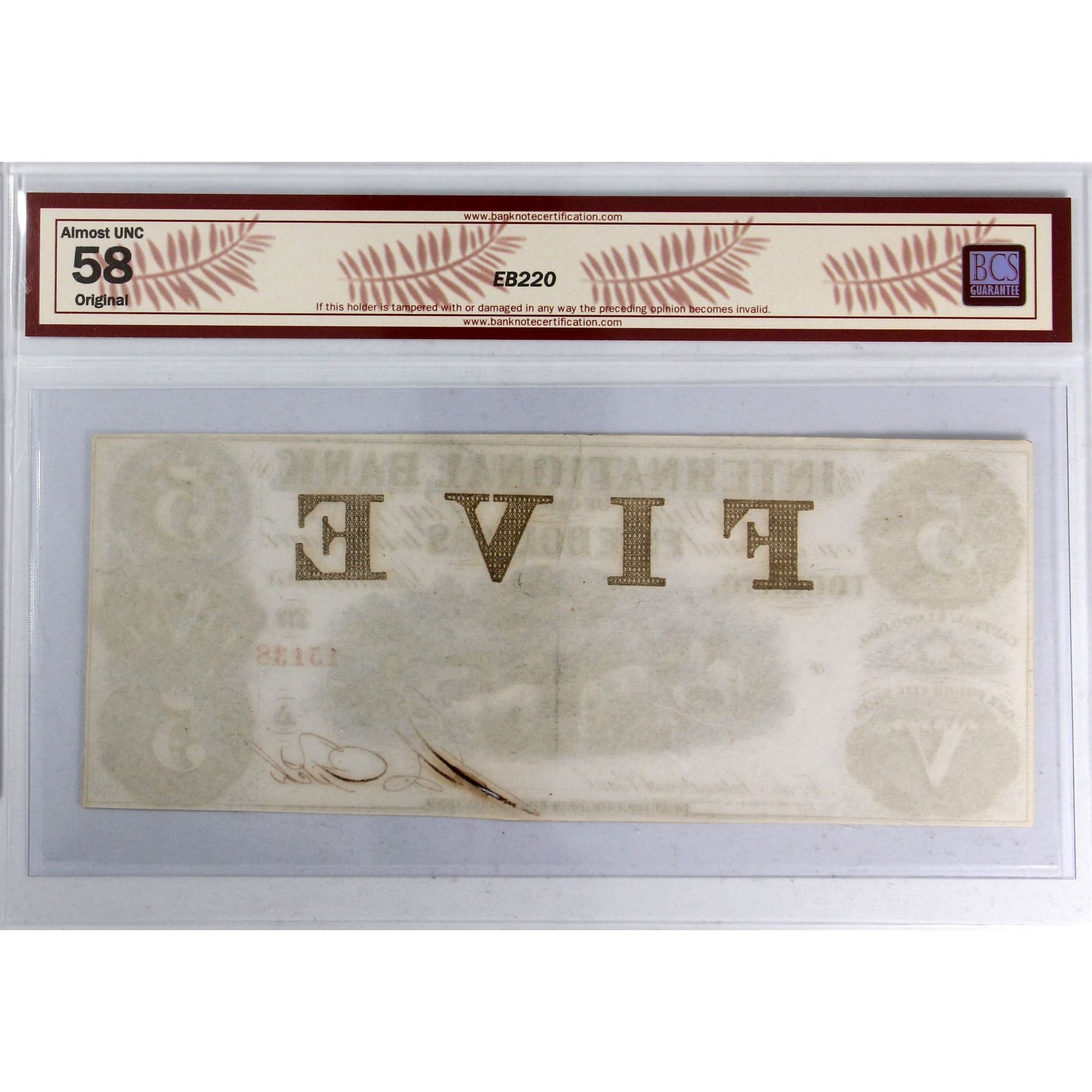 380-10-08-16 1858 $5 International Bank of Canada BCS AU58 Original. 'Small Red Sheet Number' Fitch S/N: 15138