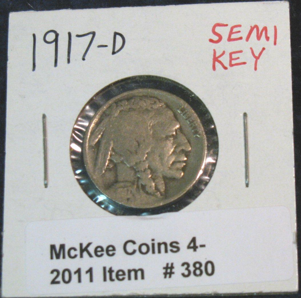 380. 1917 D Buffalo Nickel. VG-8. Semi-Key.