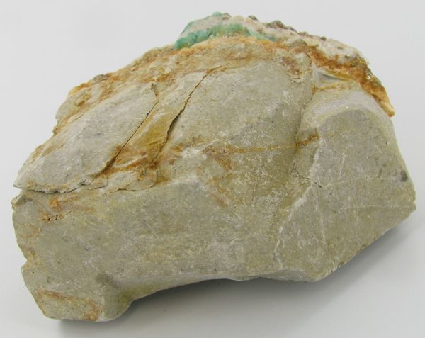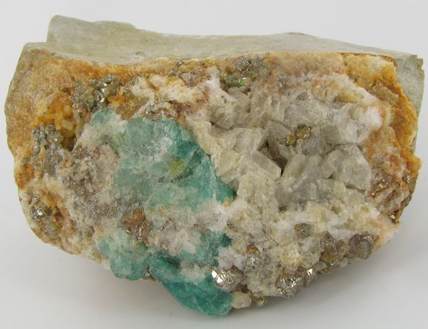 Excellent specimen with pyrite crystals and small emerald crystal vein on base material
