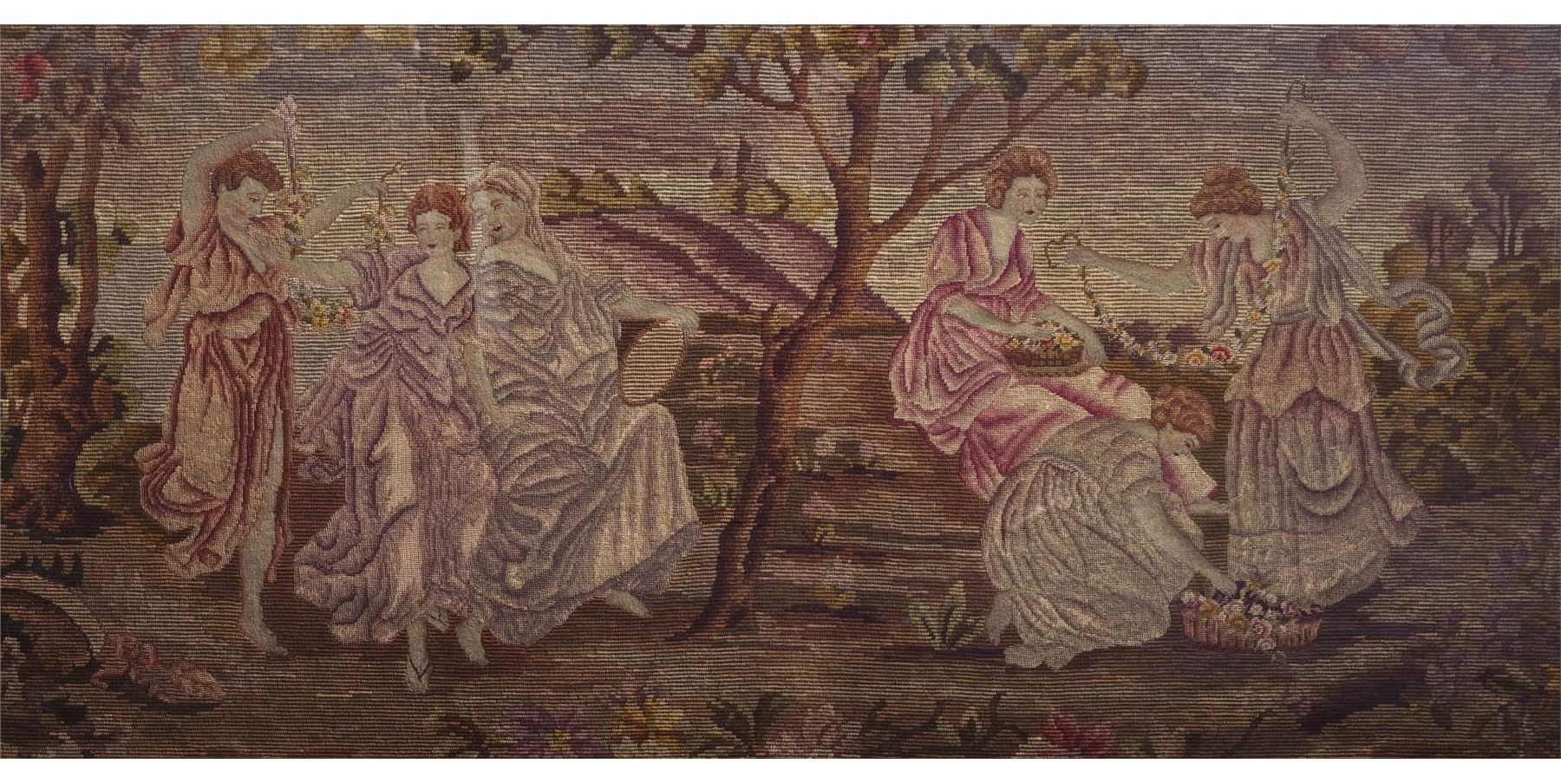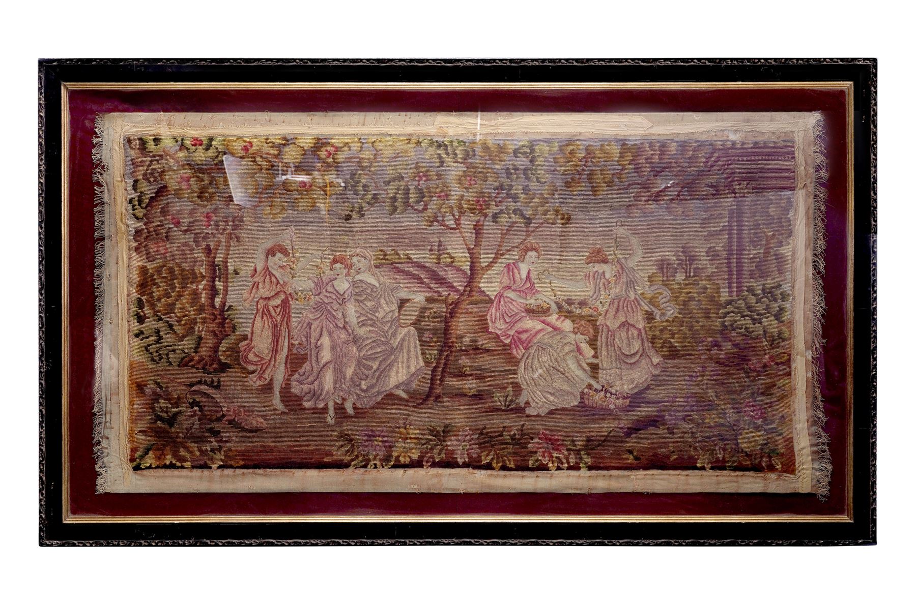 This lot consists of one embroidered 19th century European-style tapestry mounted inside a custom frame made by the framing company production used for much of the artwork in Chateau Picard. The tapestry comes with a wire hanger attached to the back. This lot exhibits a ripped and torn back. Dimensions: 69.5" x 1" x 40.5" (176.5 cm x 2.5 cm x 103 cm)