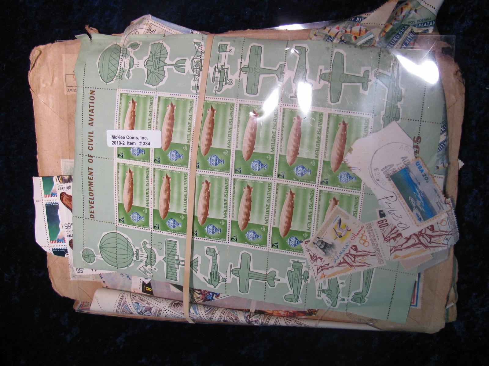 384. Sheet of Zeppelins and several hundred other foreign stamps. Most appear to be stuck together. None have been checked for value.