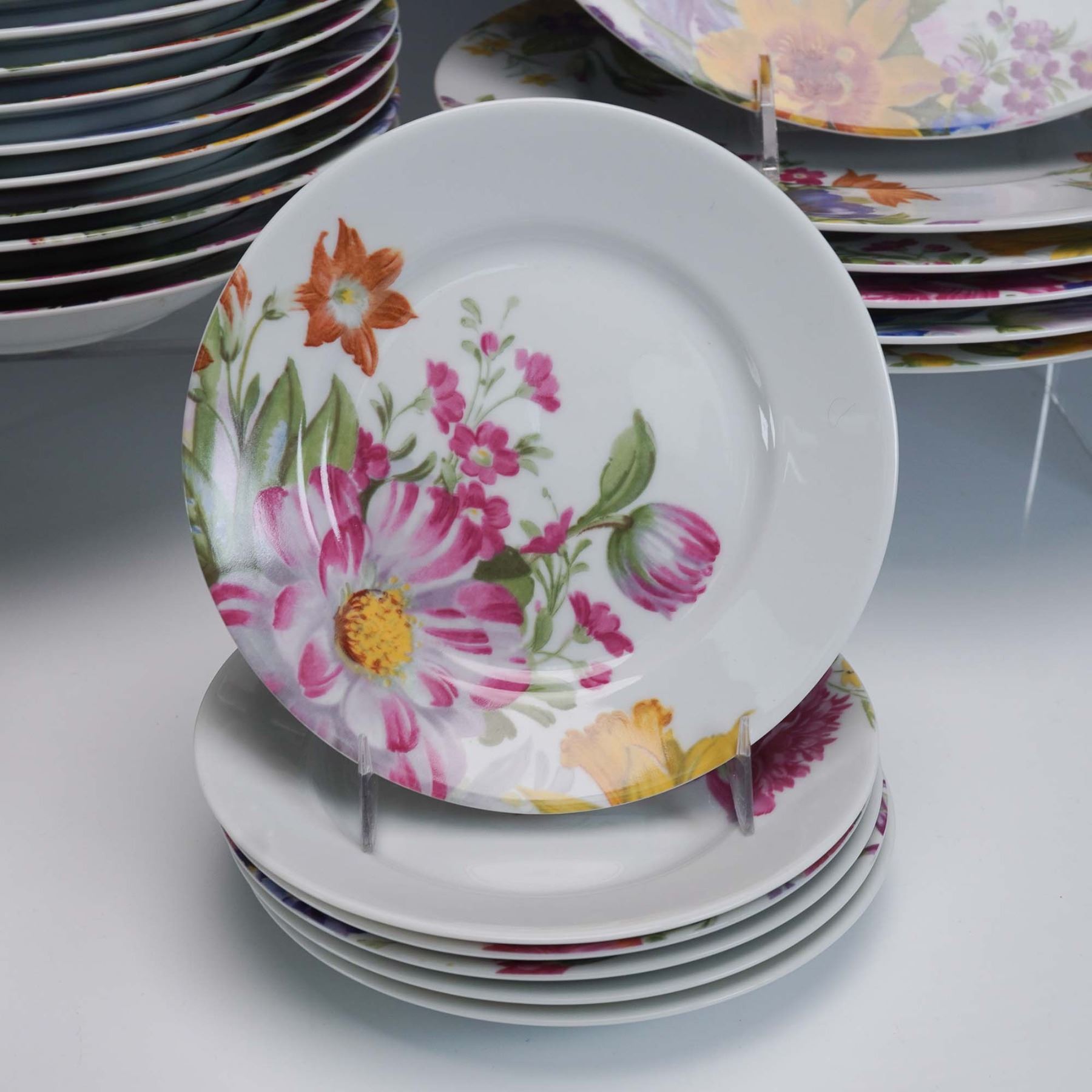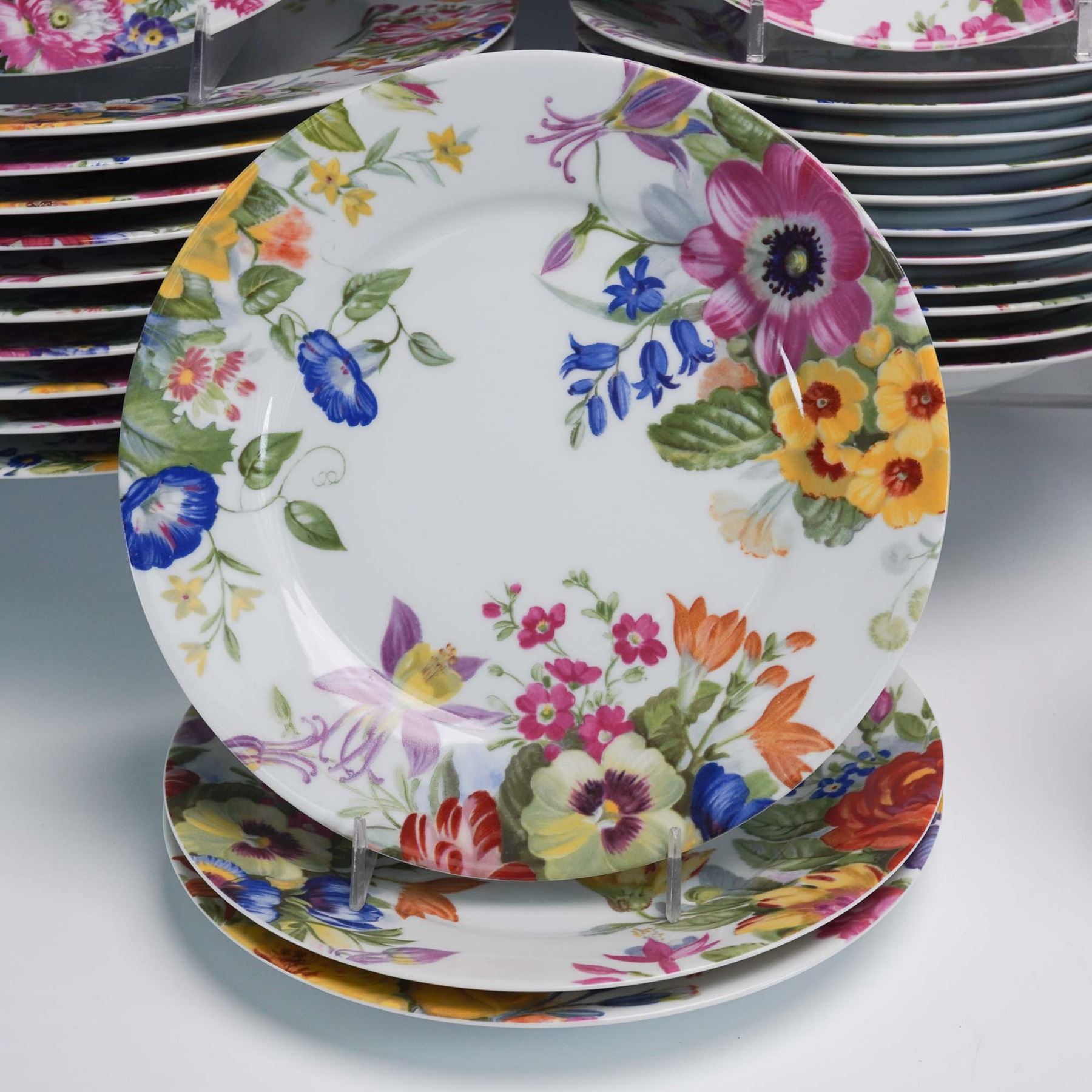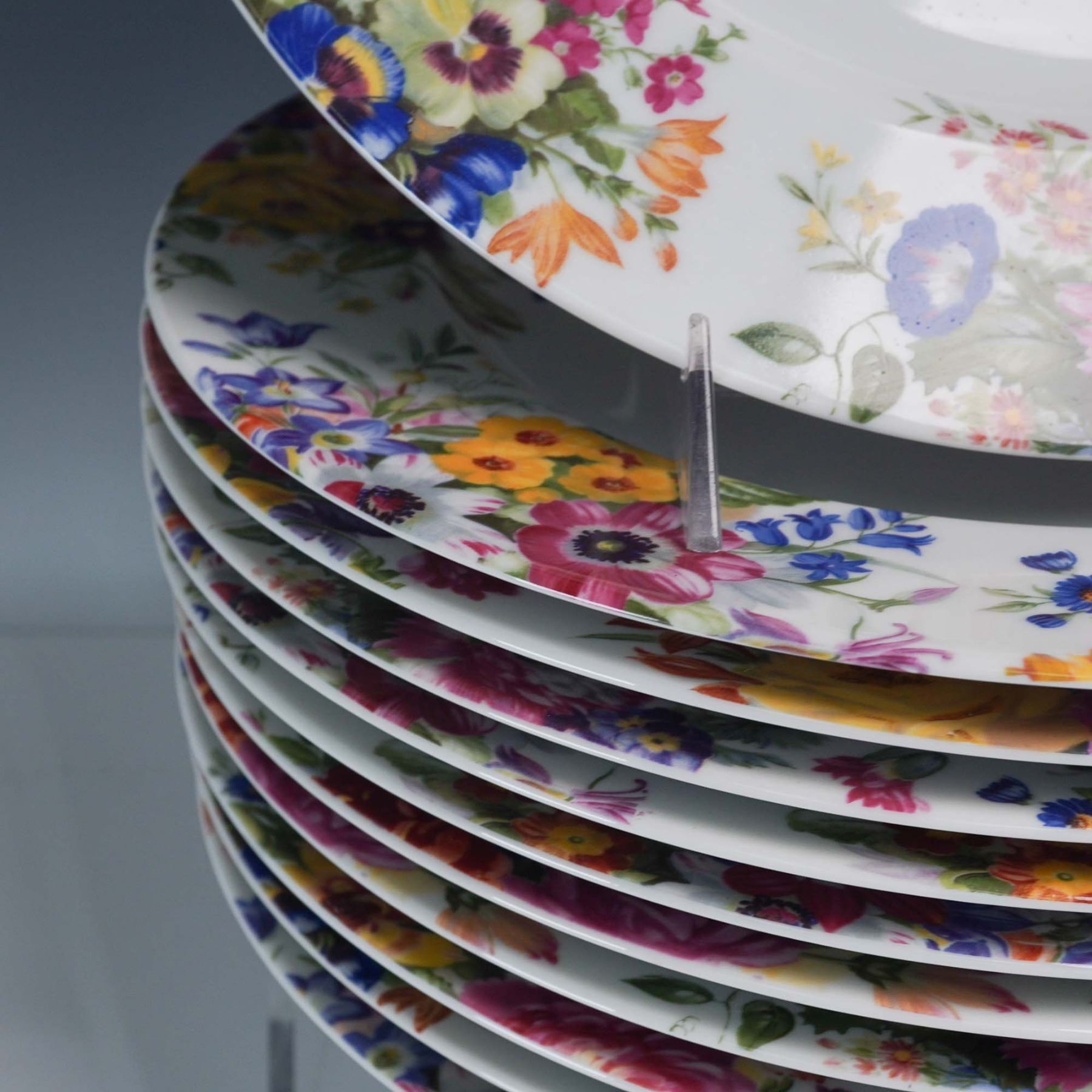 Dimensions: Bread and butter plates (6" dia), dinner plates (10.5" dia), service plates (12.25" dia), rim soup bowls (8.75" dia), salad plates (8.75" dia).