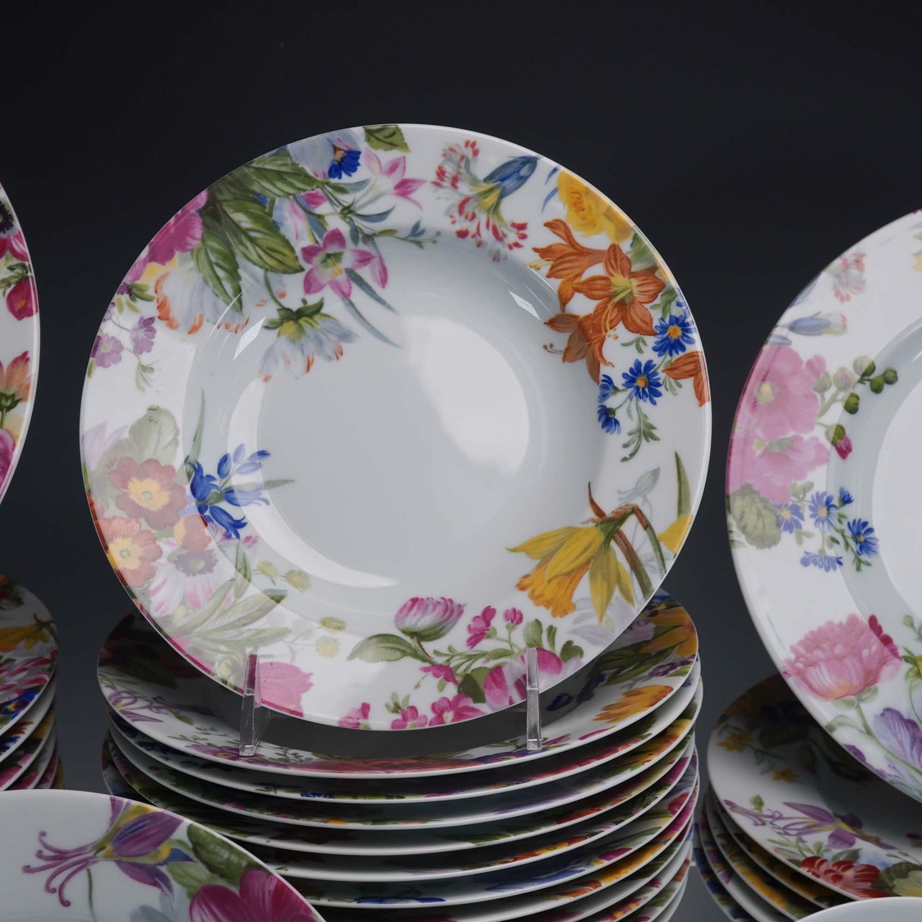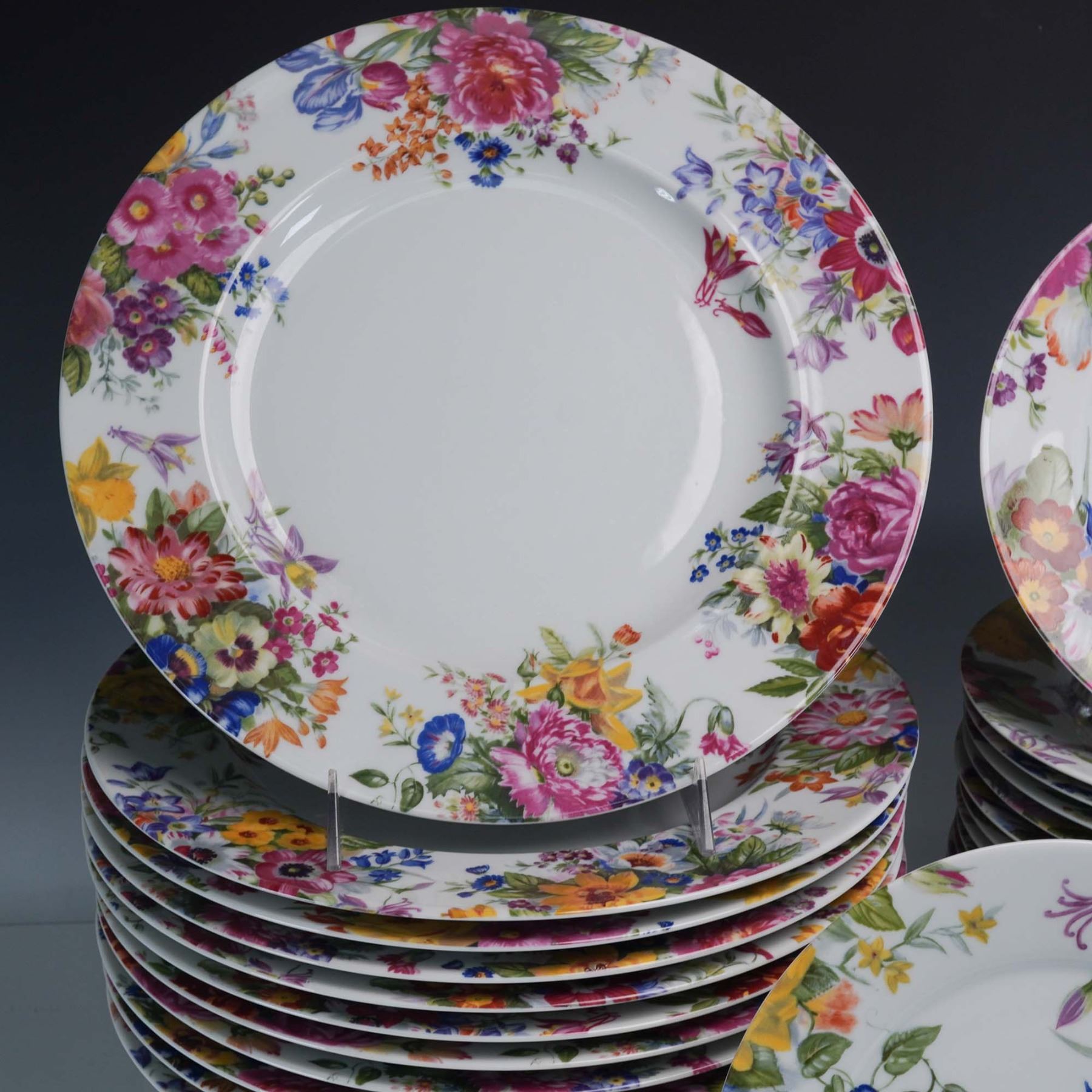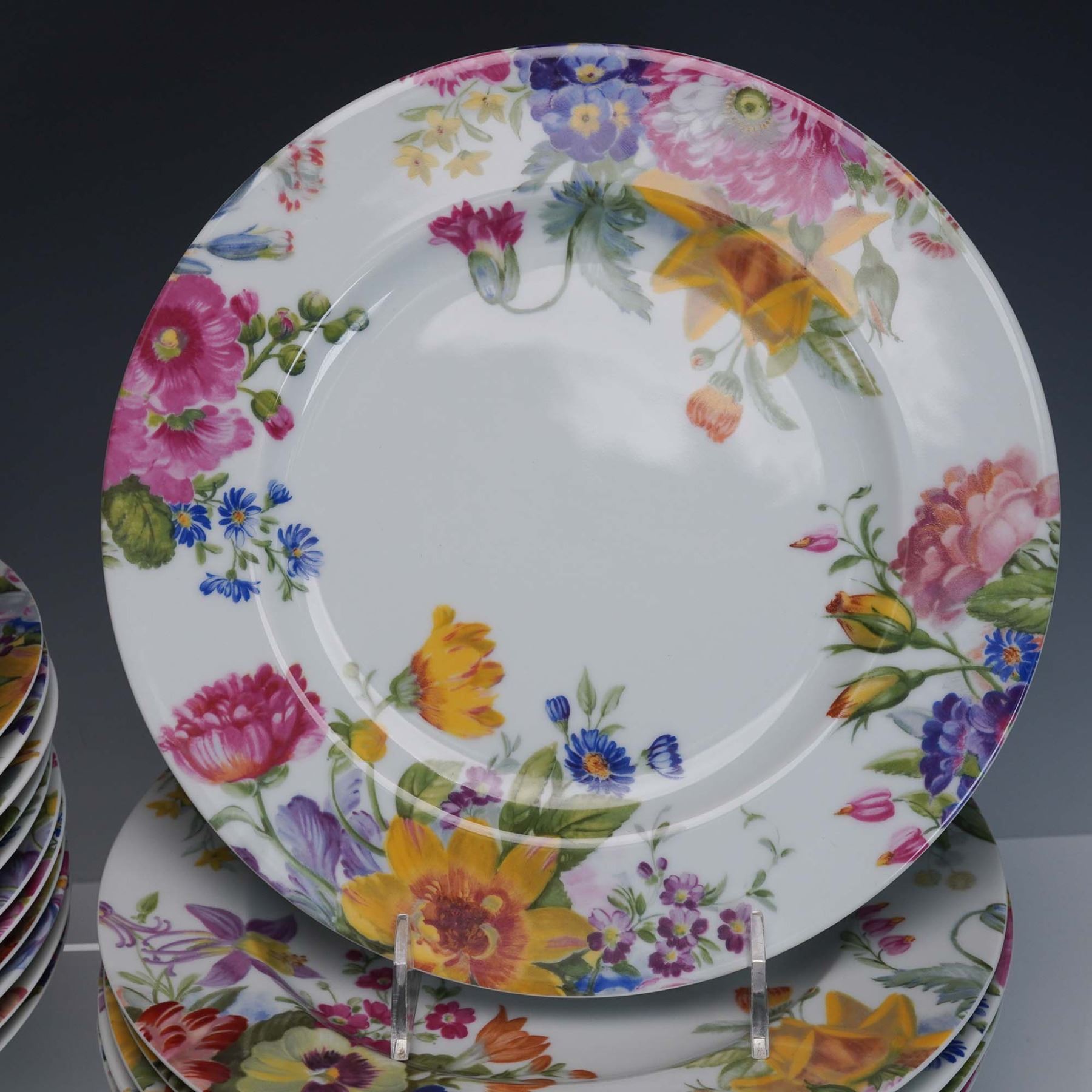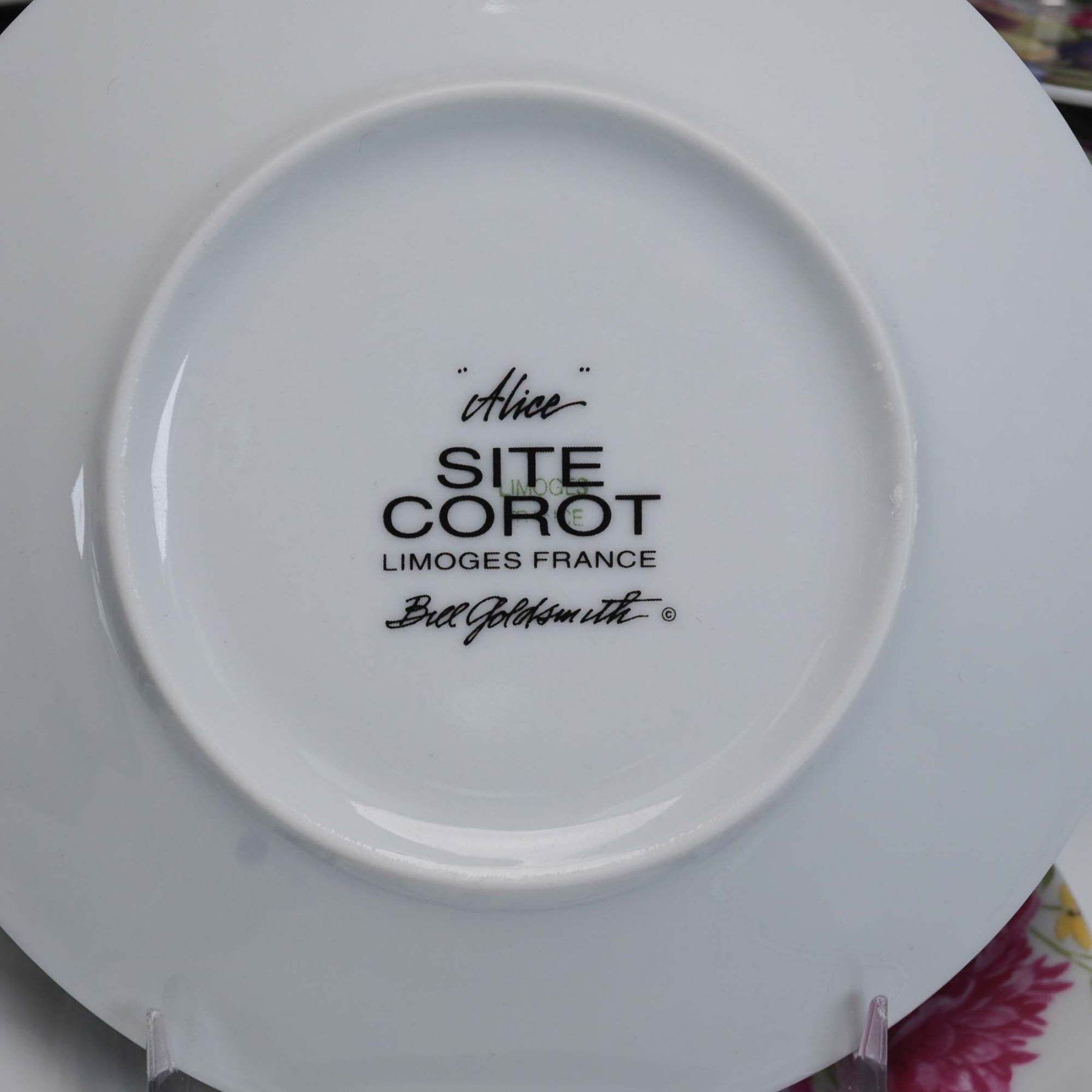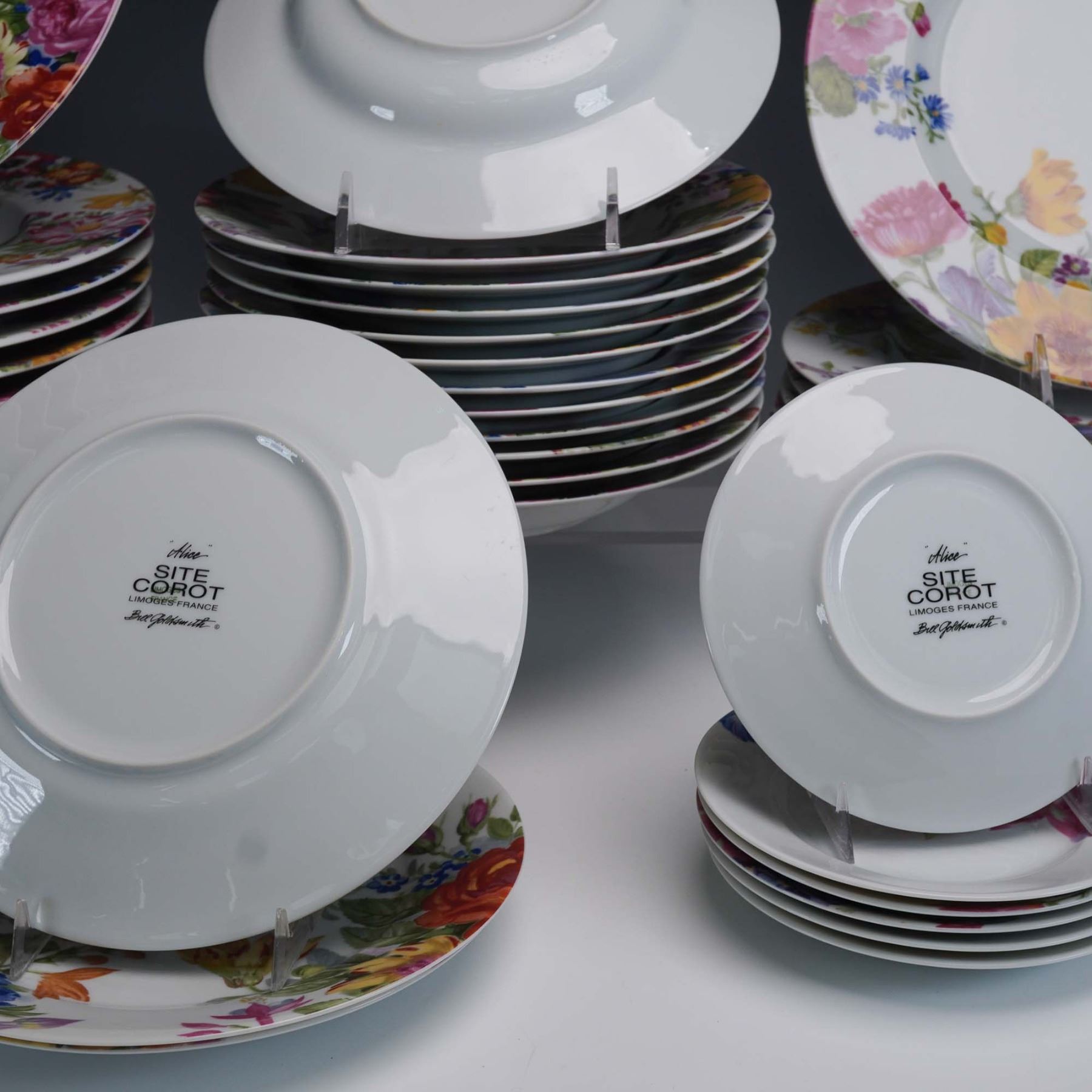 This 38-piece porcelain dinnerware set features the refined Alice pattern by Bill Goldsmith, crafted in Limoges, France. Known for its delicate floral motif and graceful form, the set reflects the timeless quality associated with French porcelain craftsmanship. Each piece bears the backstamp: Site Corot Limoges France Bill Goldsmith Alice, confirming its authenticity and origin. The set includes 6 bread and butter plates, 6 dinner plates, 11 service plates, 12 rim soup bowls, and 3 salad plates. Ideal for both collectors and those who appreciate elevated table settings, this set offers a harmonious blend of form and function with a touch of artistic design.