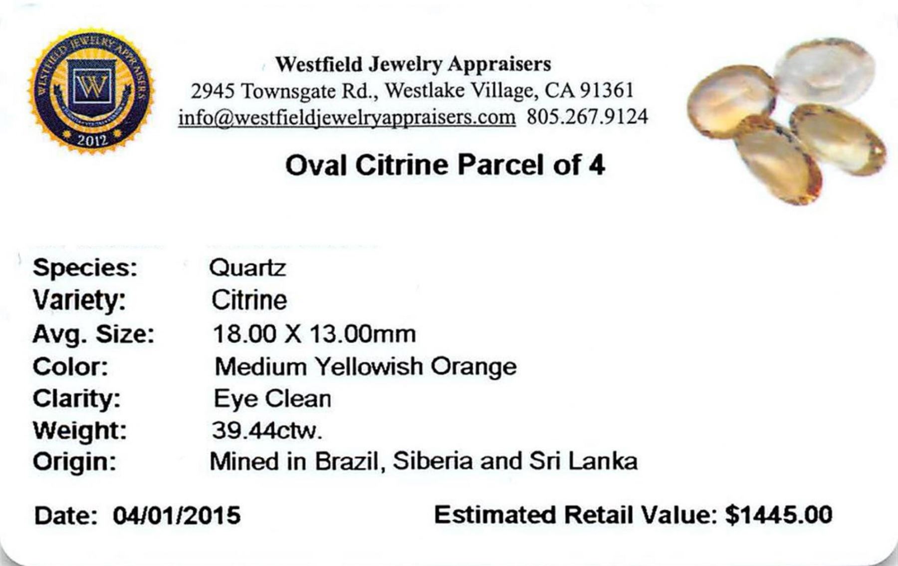 Four oval mixed cut natural citrine quartzs exact total weight 39.44ct., clarity is eye clean, type I, medium dark, slightly brownish, yellowish orange color, (GIA yO 6/2), cut is good. Westfield Appraised.