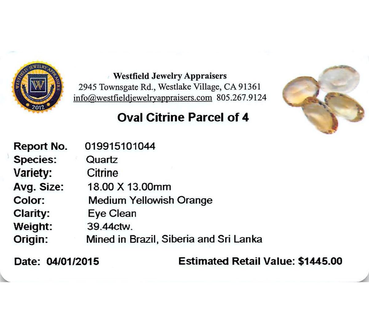 Four oval mixed cut natural citrine quartzs exact total weight 39.44ct., clarity is eye clean, type I, medium dark, slightly brownish, yellowish orange color, (GIA yO 6/2), cut is good. Westfield Appraised at $1,445.00.