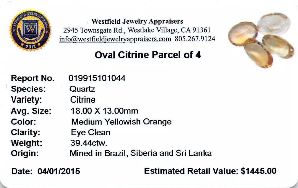 Four oval mixed cut natural citrine quartzs exact total weight 39.44ct., clarity is eye clean, type I, medium dark, slightly brownish, yellowish orange color, (GIA yO 6/2), cut is good. Westfield Appraised at $1,445.00.