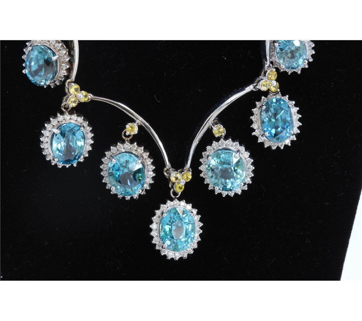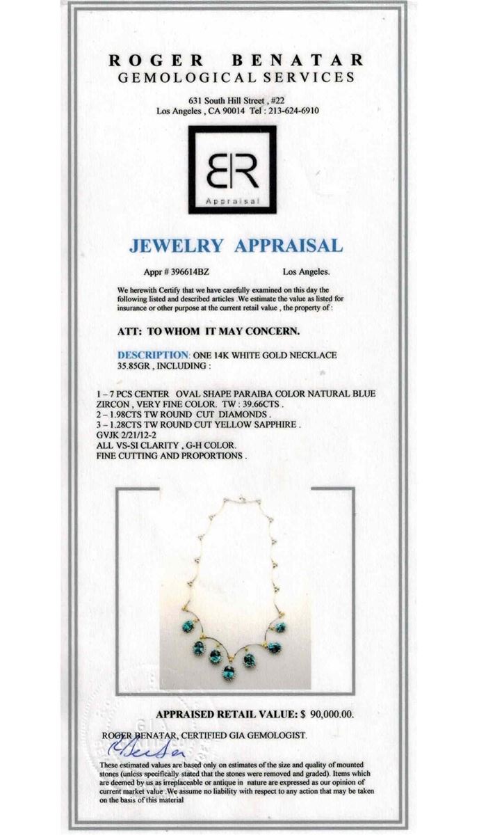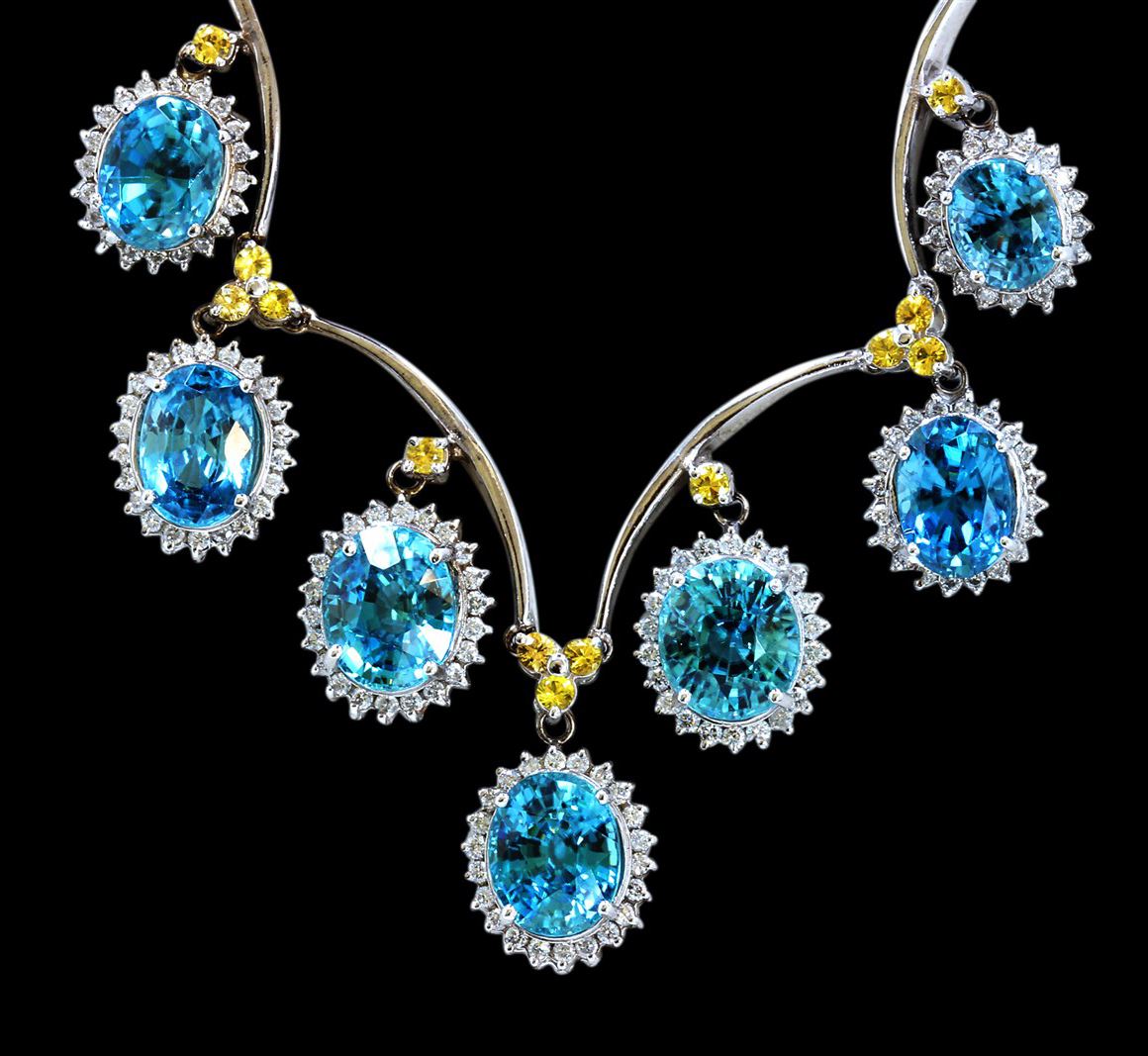 14K WHIITE GOLD NATURAL BLUE ZICRON NECKLACE:35.85 GRAMS/DIAMOND:1.98CT/YELLOW SAPPHIRE:1.28CT/BLUE ZICRON:39.66CT/#GVN1169