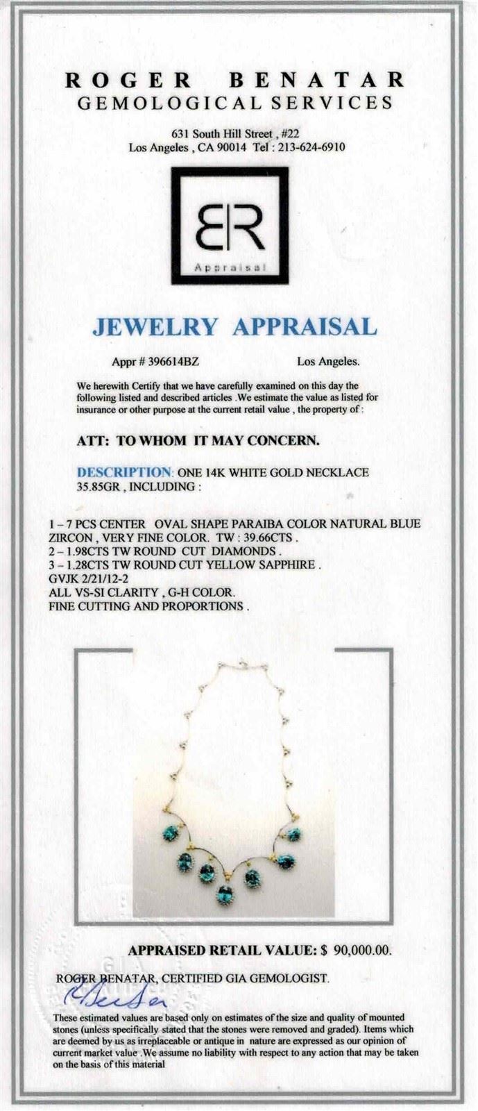 14K WHIITE GOLD NATURAL BLUE ZICRON NECKLACE:35.85 GRAMS/DIAMOND:1.98CT/YELLOW SAPPHIRE:1.28CT/BLUE ZICRON:39.66CT/#GVN1169 **The light dances across these 7 elegant 39.66ct Oval Shape Paraiba Natural Blue Zircon and they sparkle like tropic waters. Zircon is a gemstone of high intensity and precise focus. Delicately joined with 1.98ct Round Cut Diamonds and 1.28ct Round Cut Yellow Sapphire, this necklace is a long lasting investment piece, artfully crafted in 14kt white gold.**