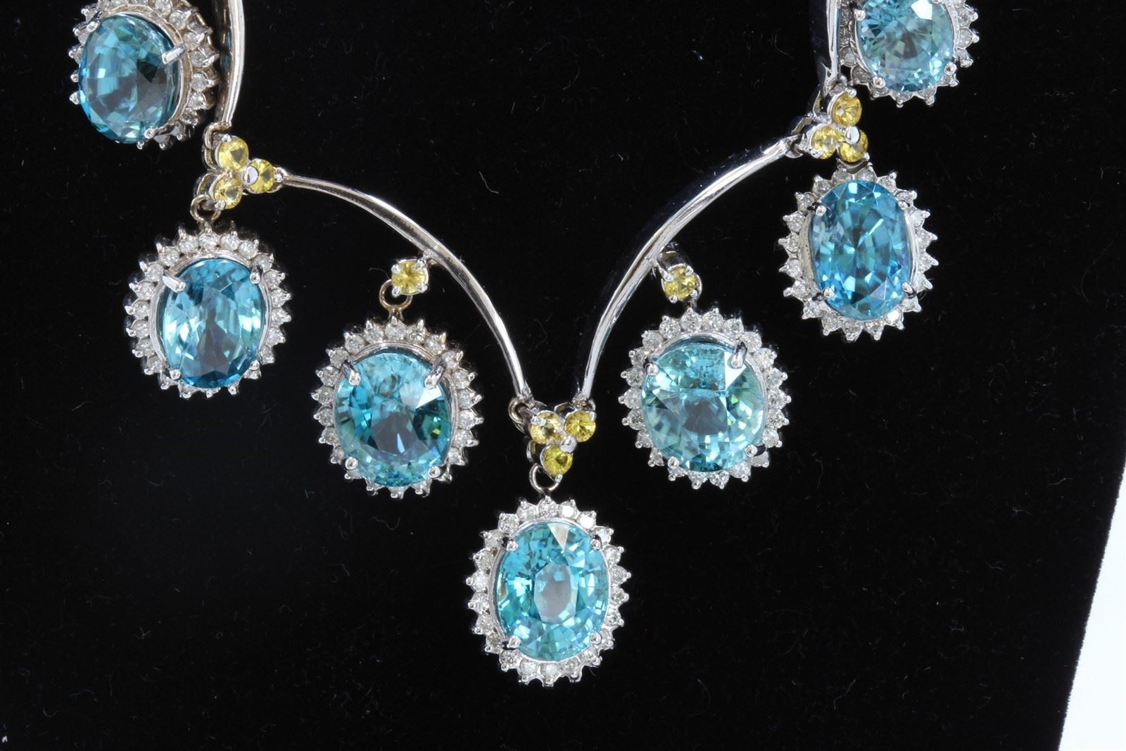 14K WHIITE GOLD NATURAL BLUE ZICRON NECKLACE:35.85 GRAMS/DIAMOND:1.98CT/YELLOW SAPPHIRE:1.28CT/BLUE ZICRON:39.66CT/#GVN1169 **The light dances across these 7 elegant 39.66ct Oval Shape Paraiba Natural Blue Zircon and they sparkle like tropic waters. Zircon is a gemstone of high intensity and precise focus. Delicately joined with 1.98ct Round Cut Diamonds and 1.28ct Round Cut Yellow Sapphire, this necklace is a long lasting investment piece, artfully crafted in 14kt white gold.**