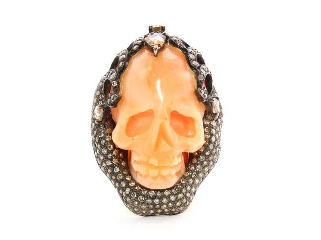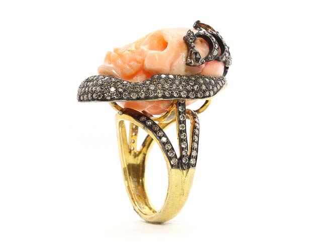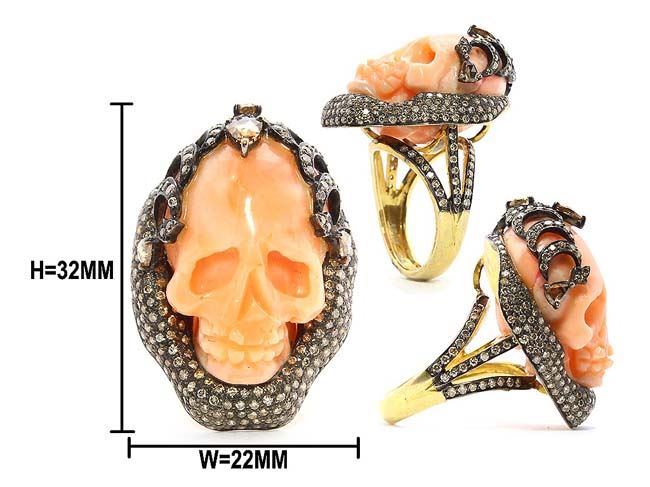 SKULL CORAL SHAPE AND DIAMOND RING/Diamond Count 1:/Diamond Total Carat :2.43/Diamond Color & Clarity:J-L/I1-I2 Single Cut /Diamond Count 2:/Diamond 2 CTW:/Diamond Count 3:/Gemstone Count 1:/Gemstone CTW:37.5/Gemstone Dimension:/Gemstone Shape:Coral /Gemstone Count 2:/Gemstone Shape:/Ring Dimension:32x22mm/Metal Type 1:18kYellow Gold:Gram Weight:0.89/Metal Type 2:over0.925Sterling Silver / Weight Gram:7.64/Gross Weight :16.52/Ring Size:7