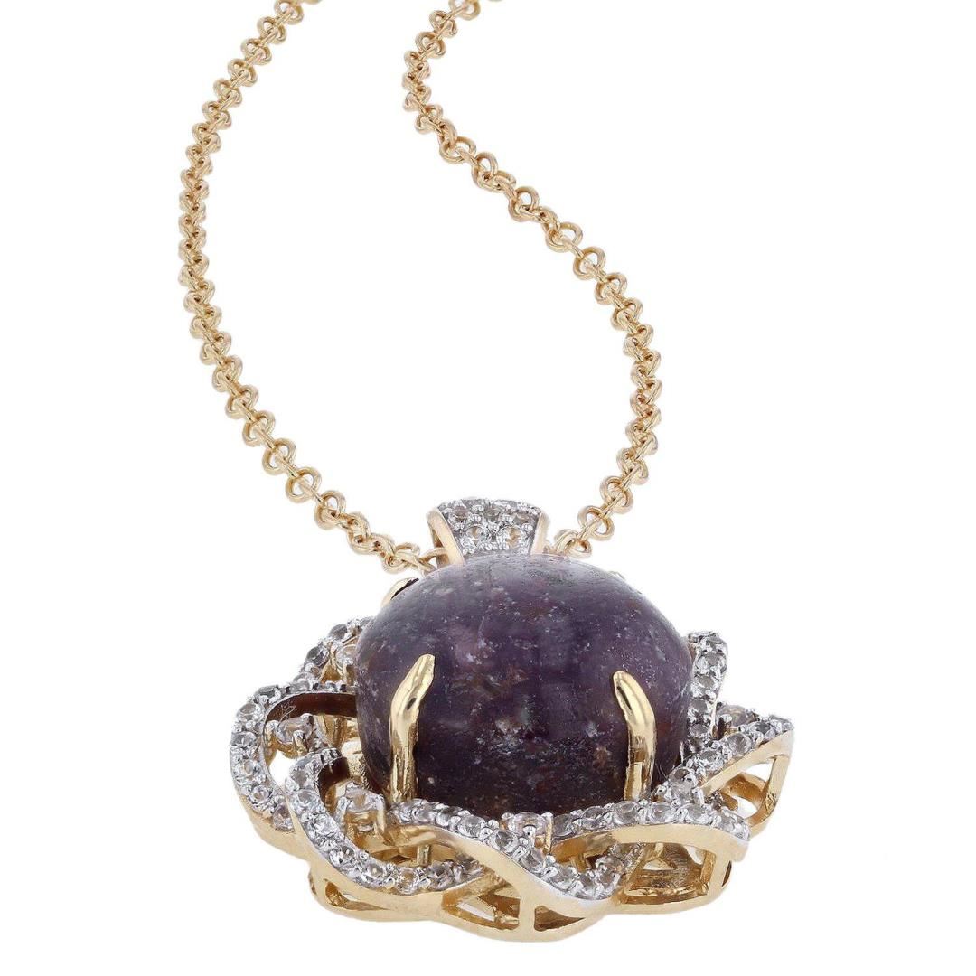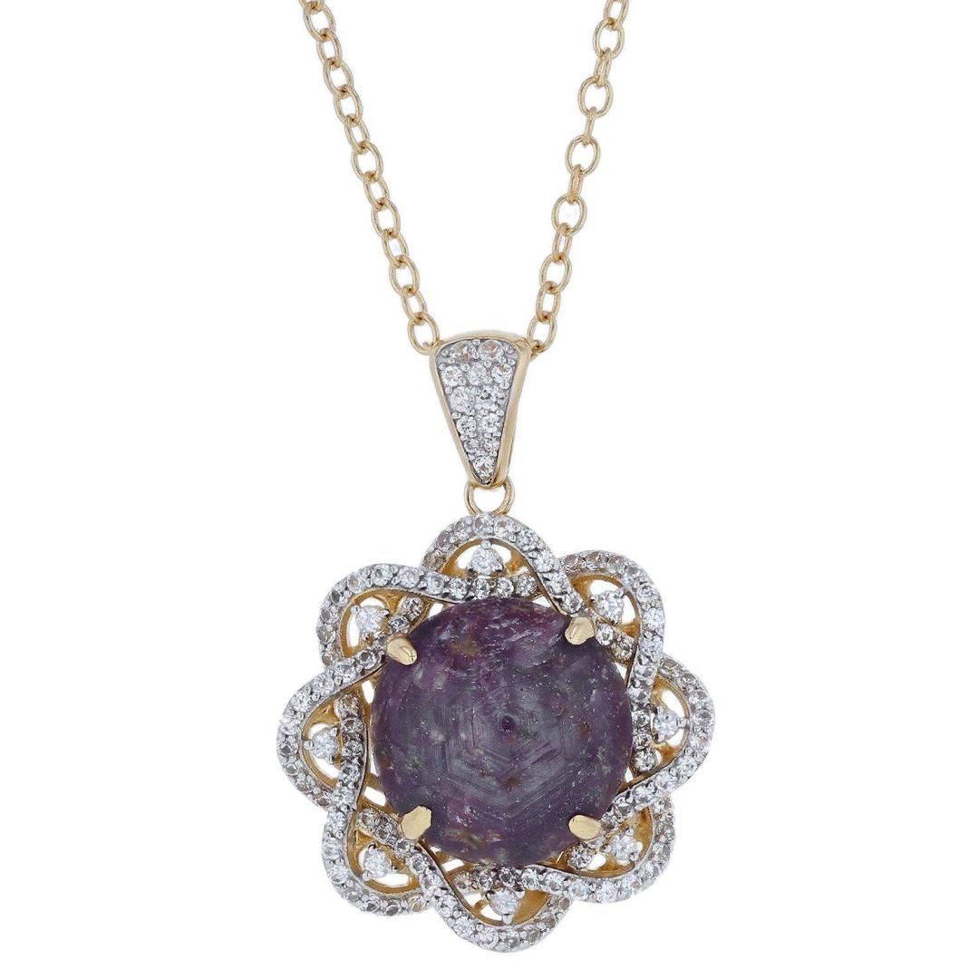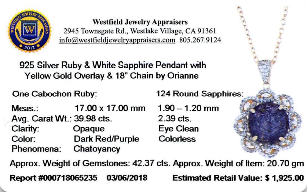 One electronically tested 925 silver with gold overlay ladies cast & assembled ruby and sapphire pendant with chain. 18†length. Trademark is Orianne. Identified with markings of "925". Condition is new, good workmanship. Containing: One prong set oval