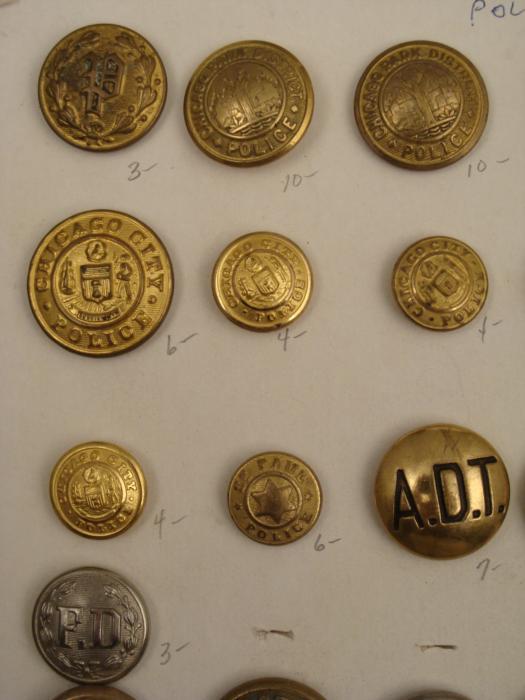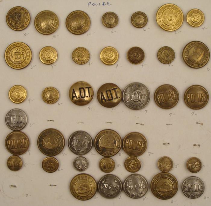 This is an antique collection of 39 police and emergency service buttons. There are four Chicago Park District, nine from the Chicago City, two A.D.T., four New Burgh, Troy, Seattle, County of Wassau New York, St. Paul, three F.D., two M.F.D, Kingston, City of Manchester F.D., fancy P, four small Police buttons, and four medium size Police buttons. They range from very good to excellent condition. All are affixed to a card. These buttons are from a comprehensive military button collection from an estate. They range from the U.S. Civil War to WWII, and are being offered in groups by category. Please see our listings now online.