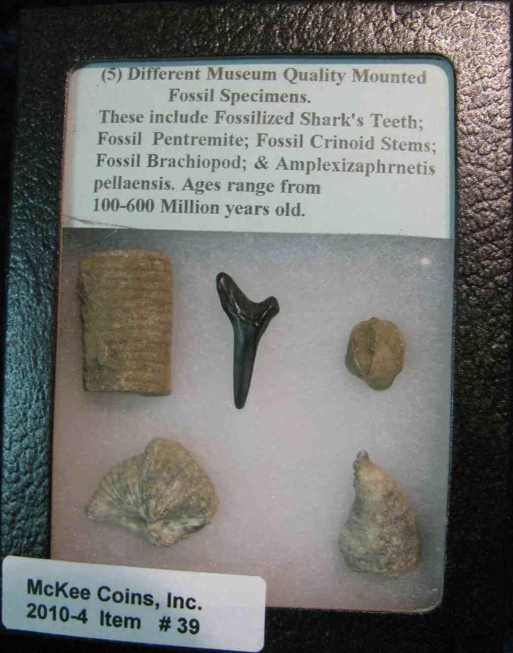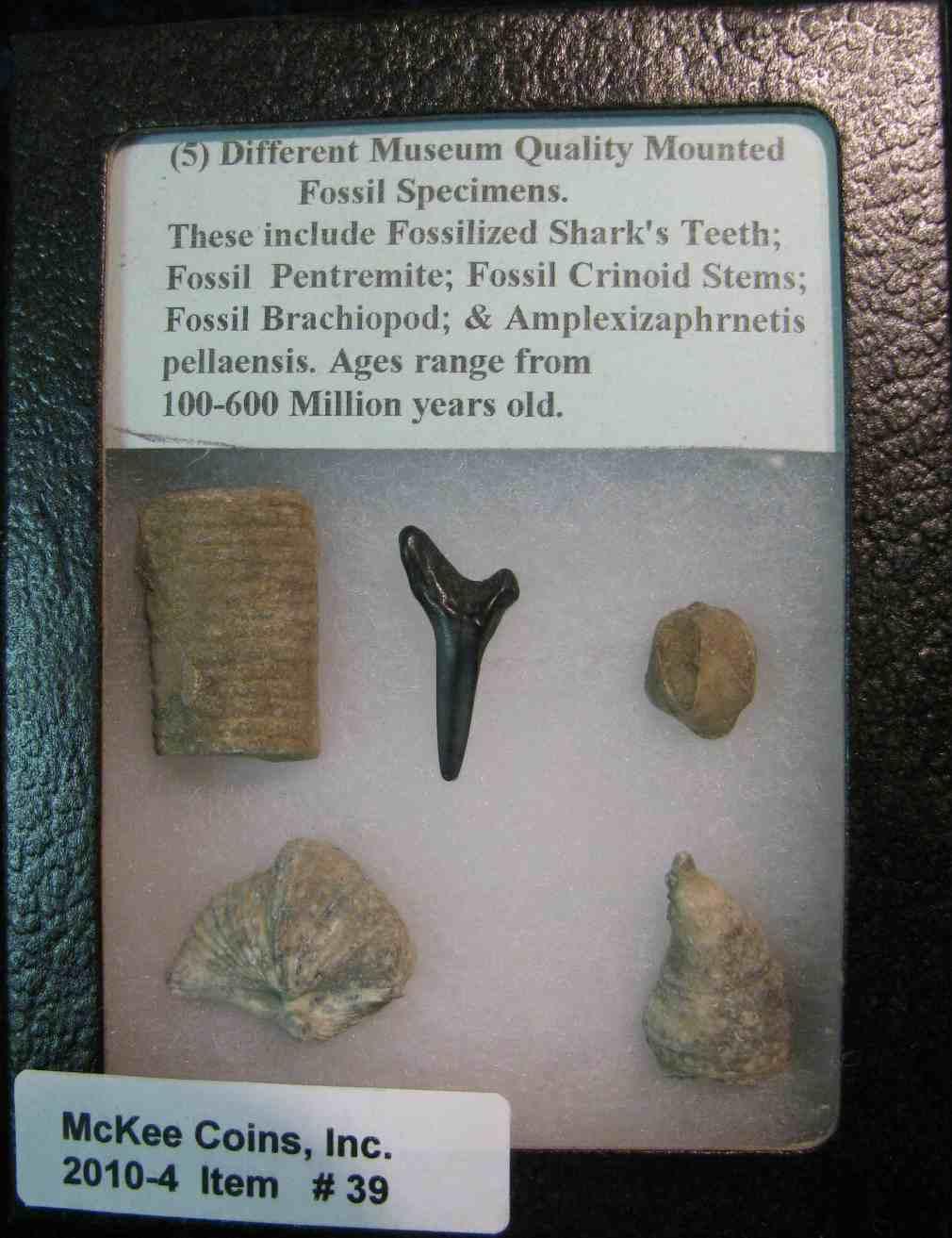 39. Glass museum case mounted "Fossil Specimens". Includes a fossilized shark's tooth, crinoids, and more.