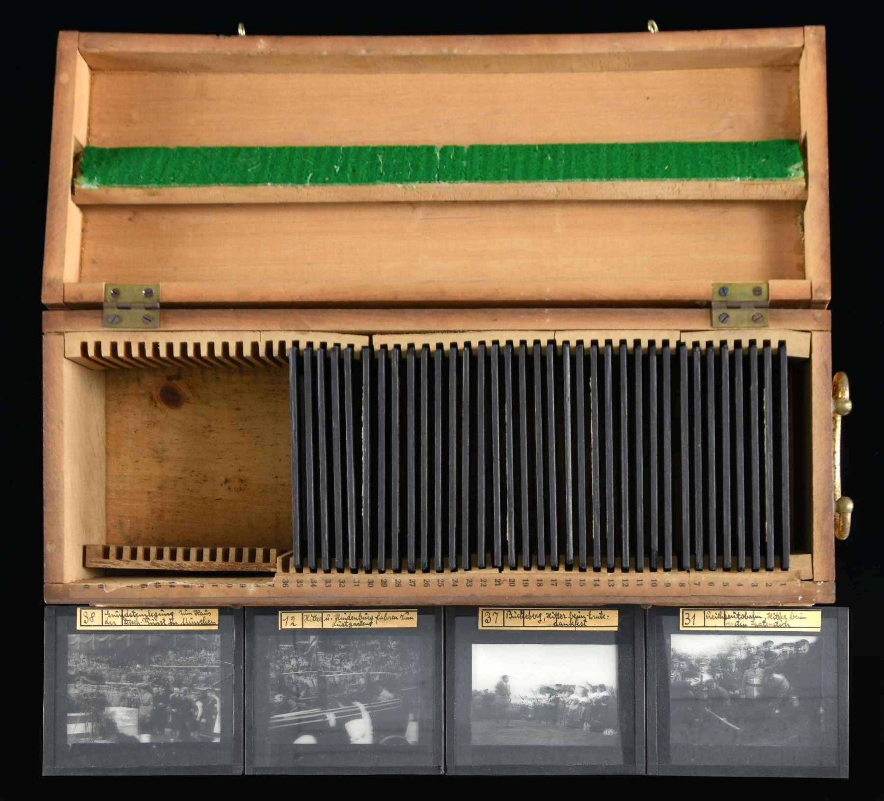 GERMANY. These slides are housed in their original wooden box that has a replaced base. The slides show many interesting views of WWII Germany, including several showing Adolf Hitler. Many show soldiers in uniform, and there are some interesting views of the RAD in formation as well as parading. There are views of Party rallies, and even a few views of civilians working to support the war effort. An exceptionally interesting and desirable set for the student of German military life and uniforms. CONDITION: Only one of the entire set has a crack; the rest show very light wear. (02-23661/BF). $400-700.