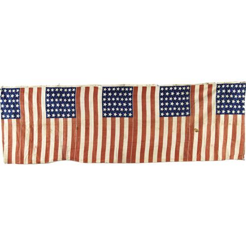 <B>39 Star Flag Bolt of Cloth, Uncut.</B></I> This piece of cloth is an uncut of six unfinished flags. It is an interesting item for several reasons: the 39 star flag was never an official flag. In 1889, flag manufacturers believed that both North and South Dakota would be admitted as one state, however, both Dakotas, Montana, and Washington were accepted into the Union in November of 1889, and Idaho was admitted in July of 1890. So any 39 star flags were likely made in the fall of 1889. Many "vexillophiles" love to collect and seek "unofficial" flags, because of their rarity and novelty; while this is not a standard display flag, it nonetheless offers the collector an opportunity to own six 39 star flags printed on the same piece of cloth! The condition is excellent, aside from some slight "aging" throughout, namely frayed borders and one area of foxing in the center of the material. Measures 76.5" x 24".