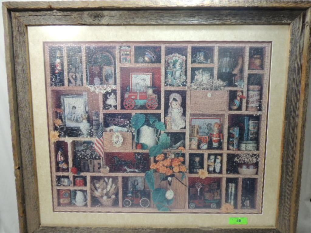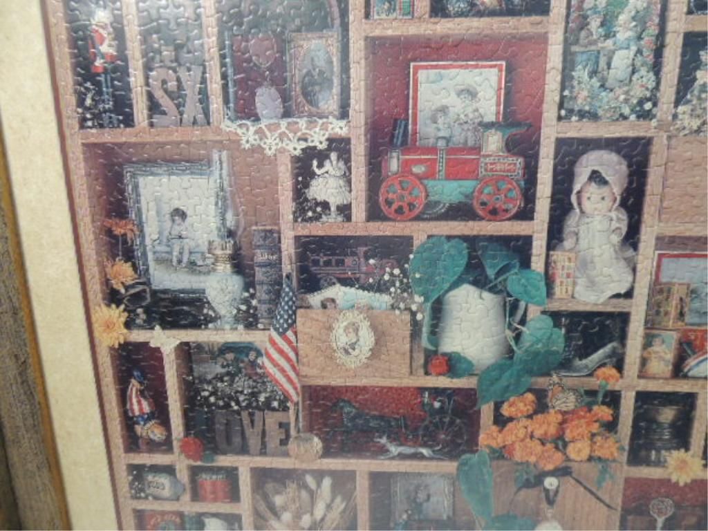 BEAUTIFULLY FRAMED AND MATTED FINISHED PUZZLE. INTERESTING VINTAGE AMERICANA THEMED PUZZLE. SEE PHOTOGRAPHS FOR MORE.