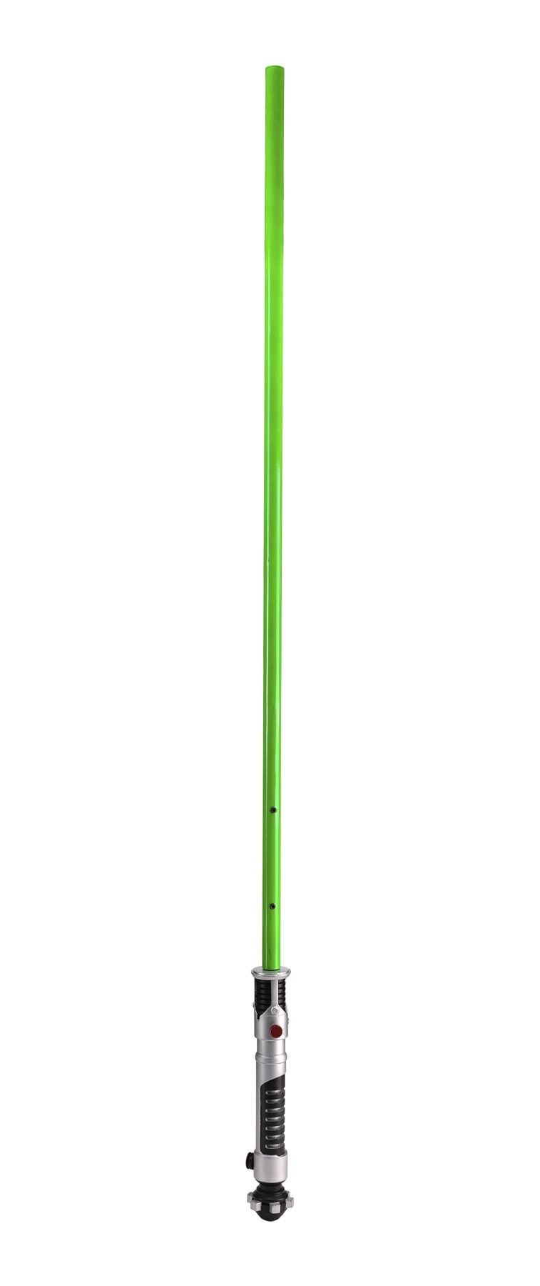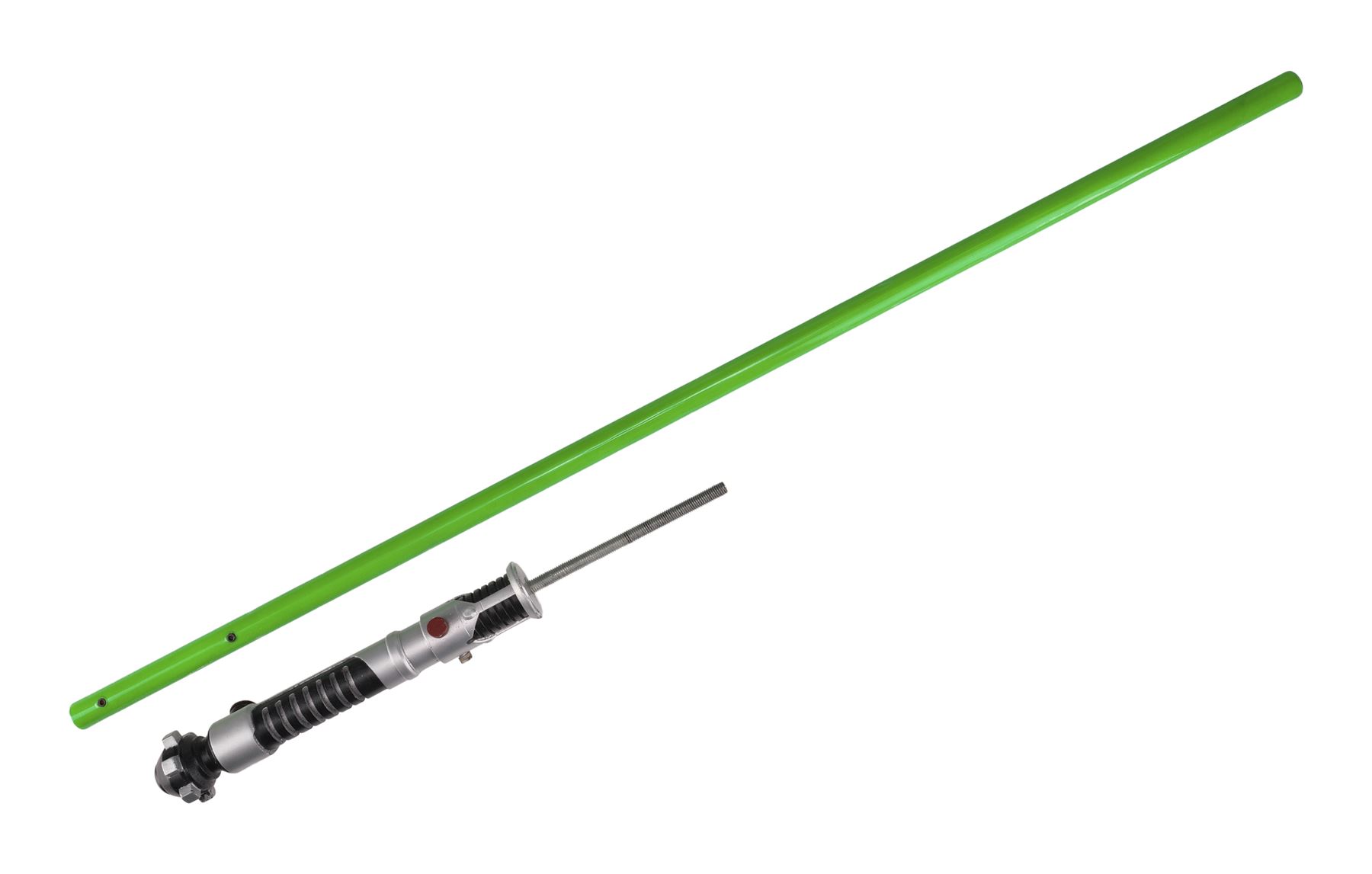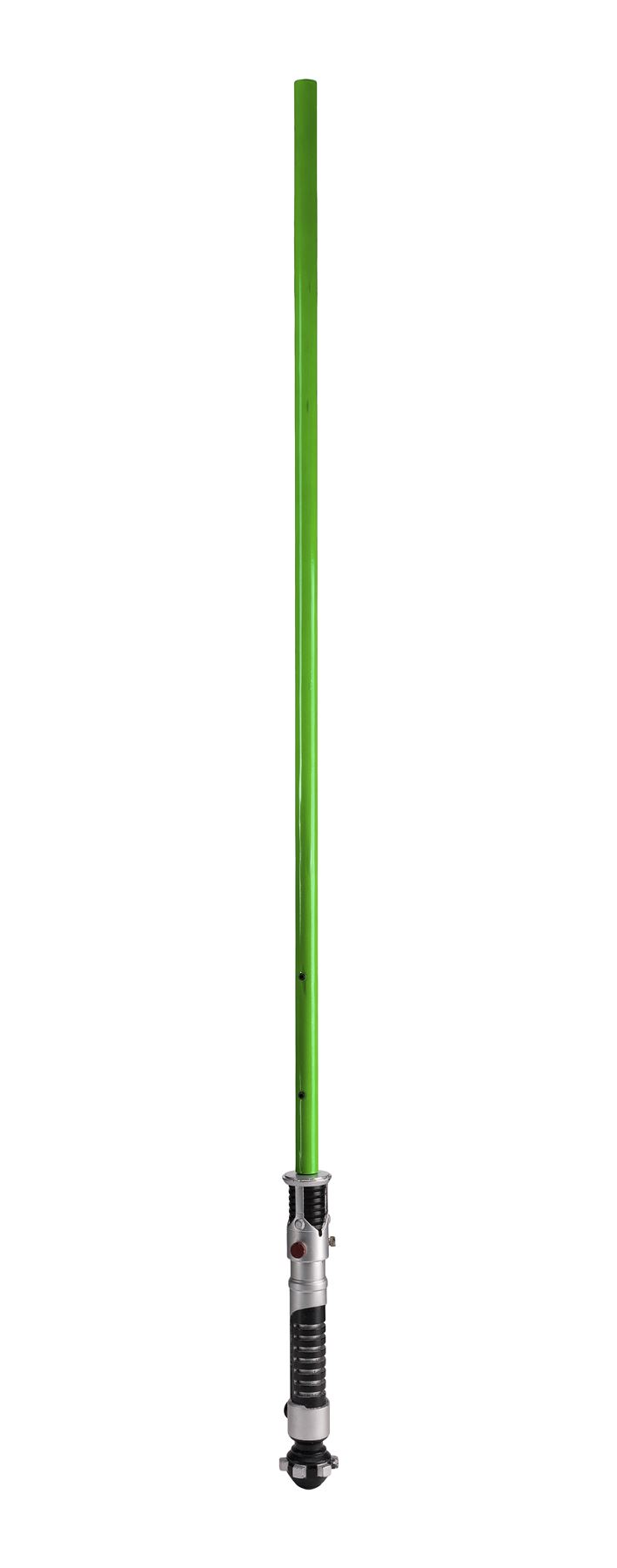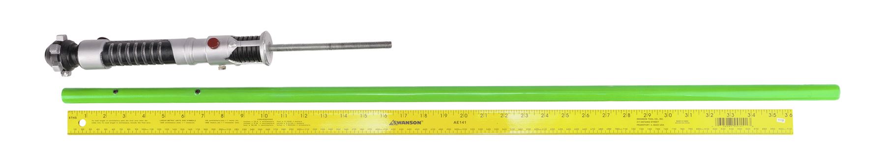 This metal "blade" (staff) was designed to be affixed to a hilt for dueling sequences during the production, but ultimately unused during filming. It is wrapped with green tape and features two holes, as well as larger Allen head set screws used to lock the blade to the hilt, a design used for production of The Phantom Menace. The hilt exhibits minor cracks in the resin and staining on the rod, while the blade is very clean and exhibits no signs of use. Dimensions: 48" x 2" x 2" (122 cm x 5 cm x 5 cm)