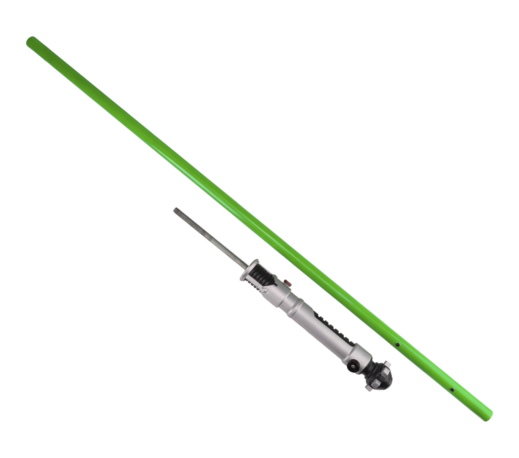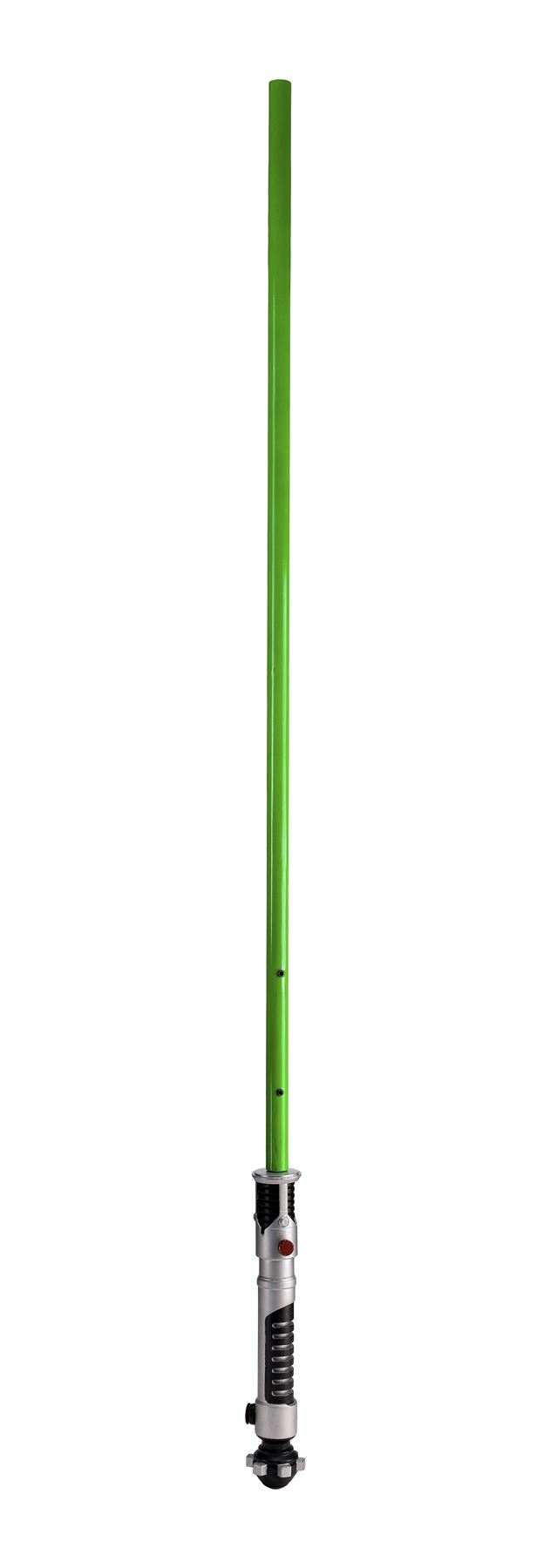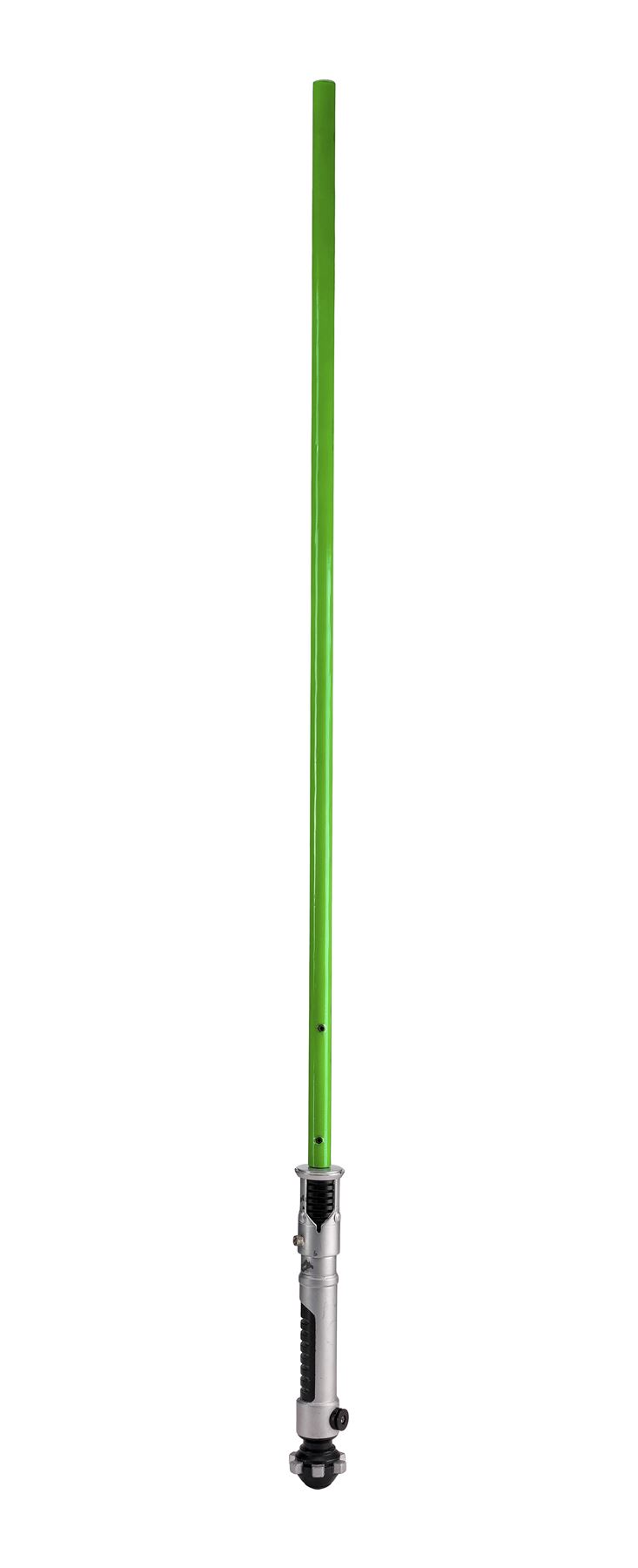 This metal "blade" (staff) was designed to be affixed to a hilt for dueling sequences during the production, but ultimately unused during filming. It is wrapped with green tape and features two holes, as well as larger Allen head set screws used to lock the blade to the hilt, a design used for production of The Phantom Menace. The hilt exhibits minor cracks in the resin and staining on the rod, while the blade is very clean and exhibits no signs of use. Dimensions: 48" x 2" x 2" (122 cm x 5 cm x 5 cm)