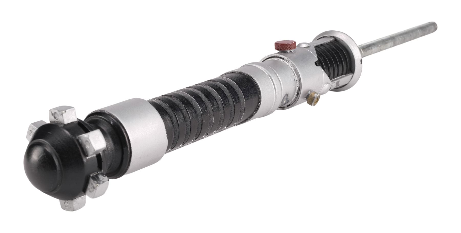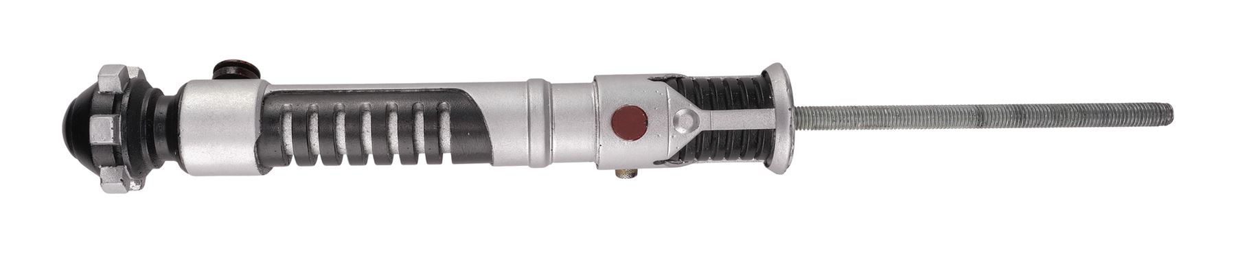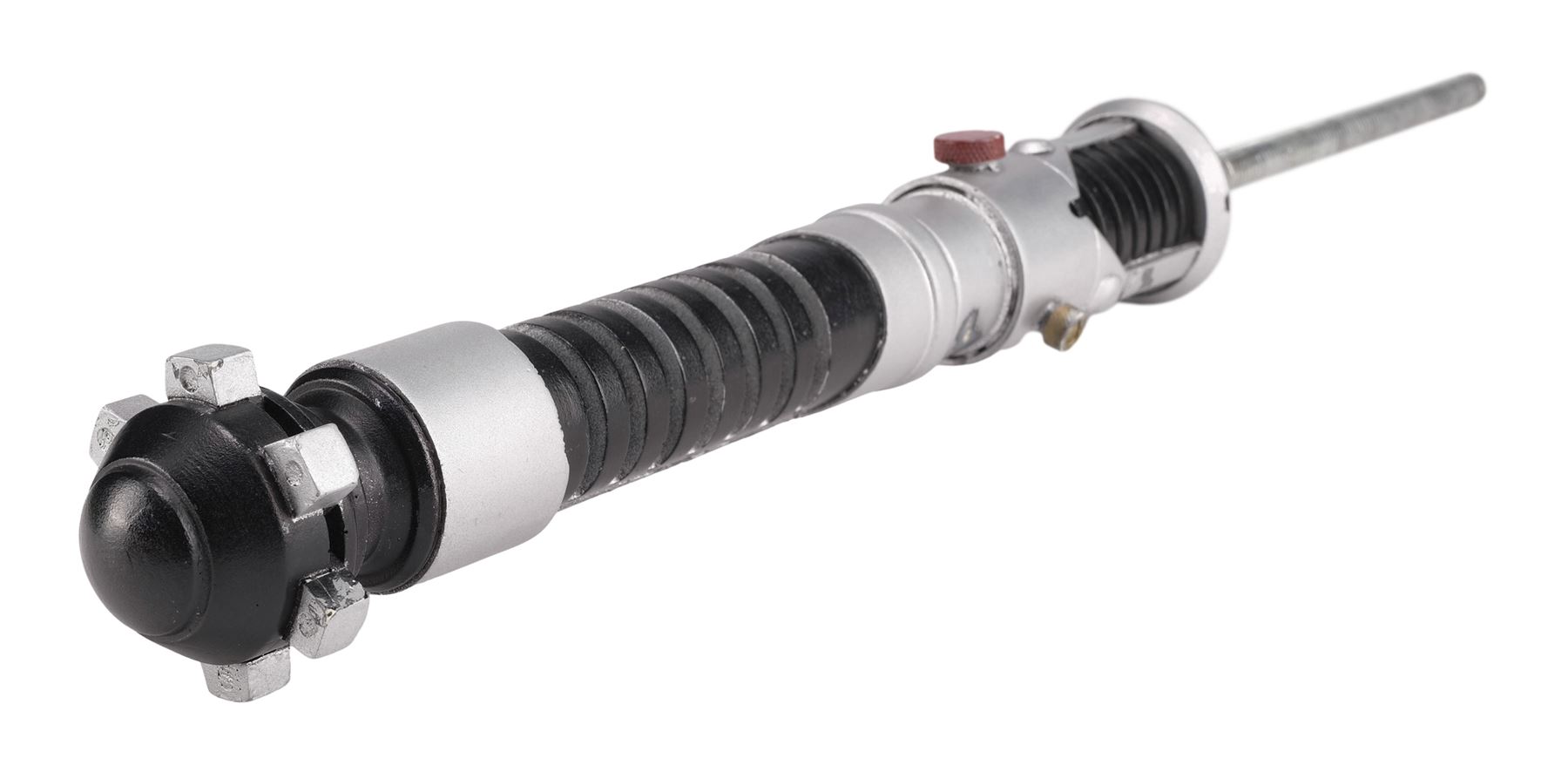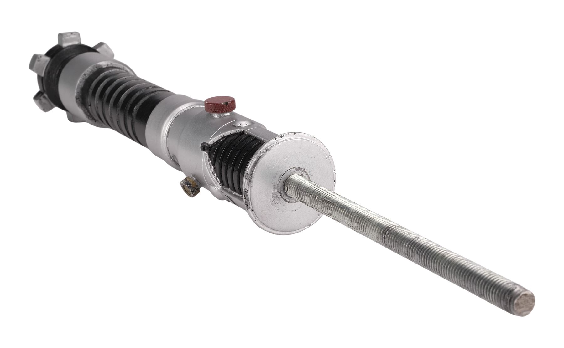 This lightsaber hilt features a ridged resin handgrip with a rounded pommel cap inset with a threaded steel rod and painted silver-color, black, and red to simulate a metallic finish. The threaded rod allowed for installation of aluminum blades that were used for dueling sequences and replaced frequently as they were damaged on set.
