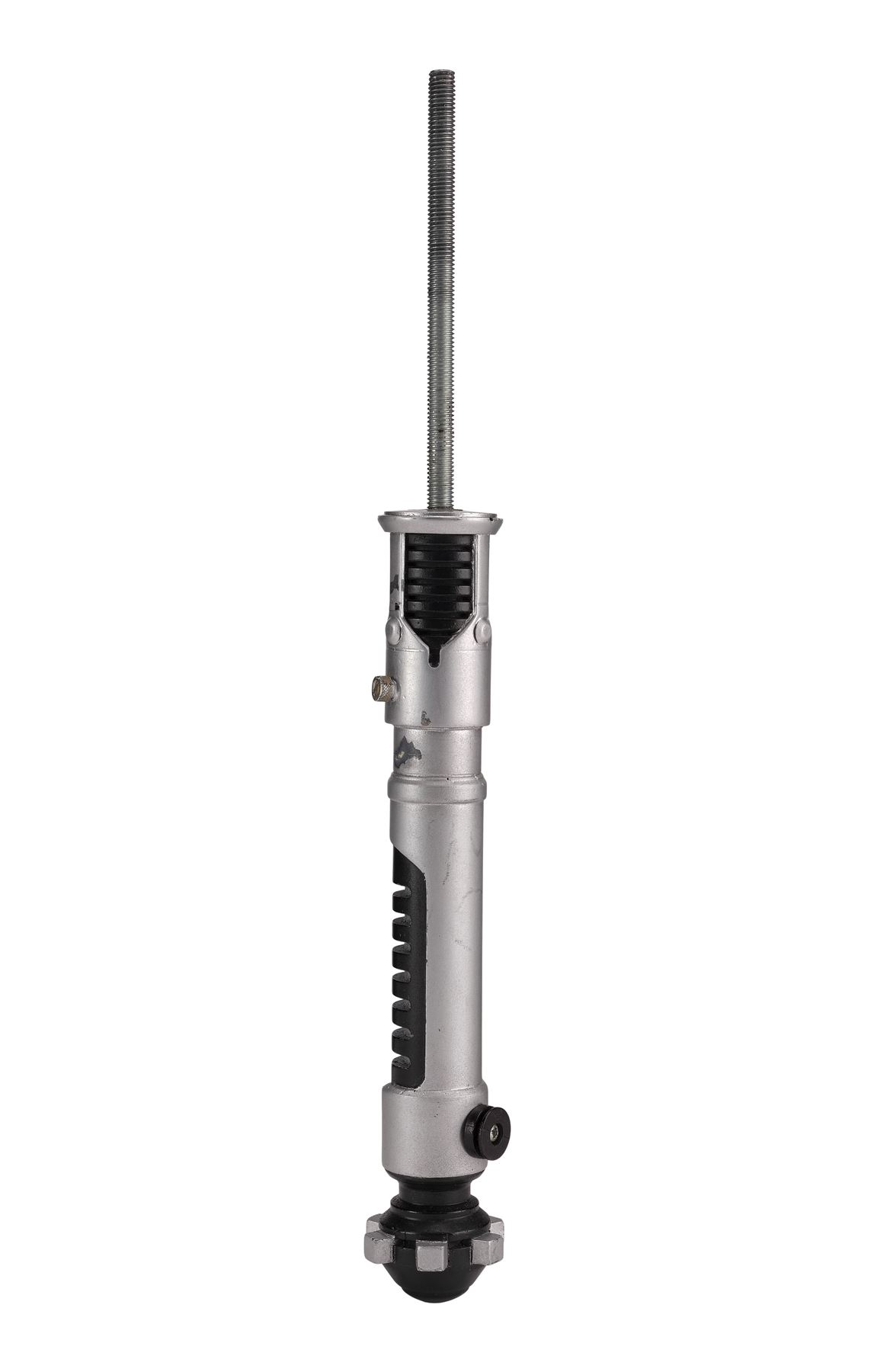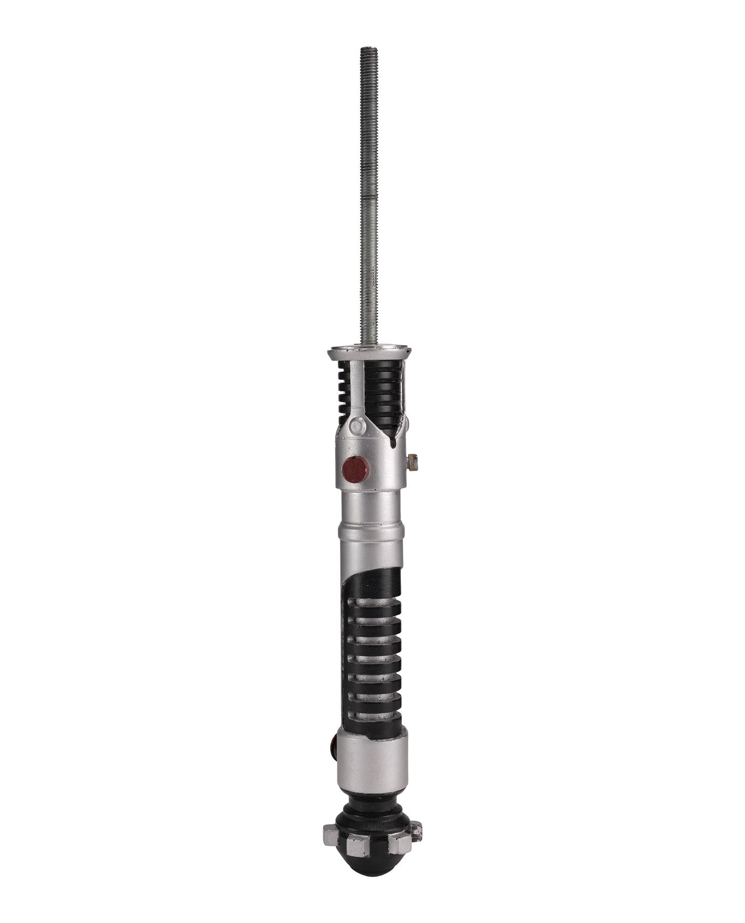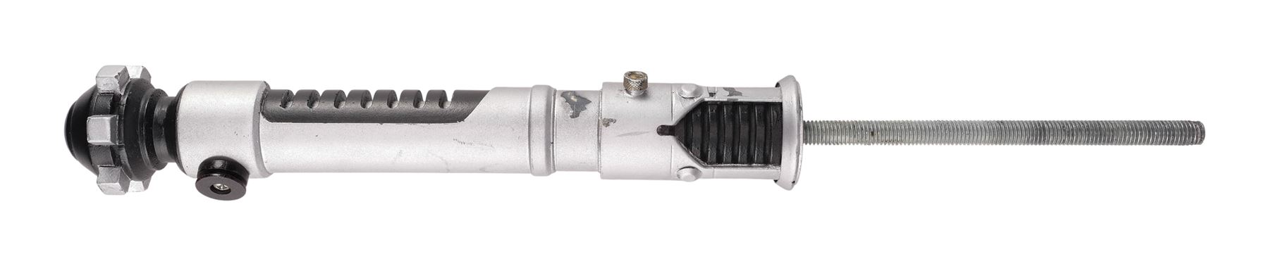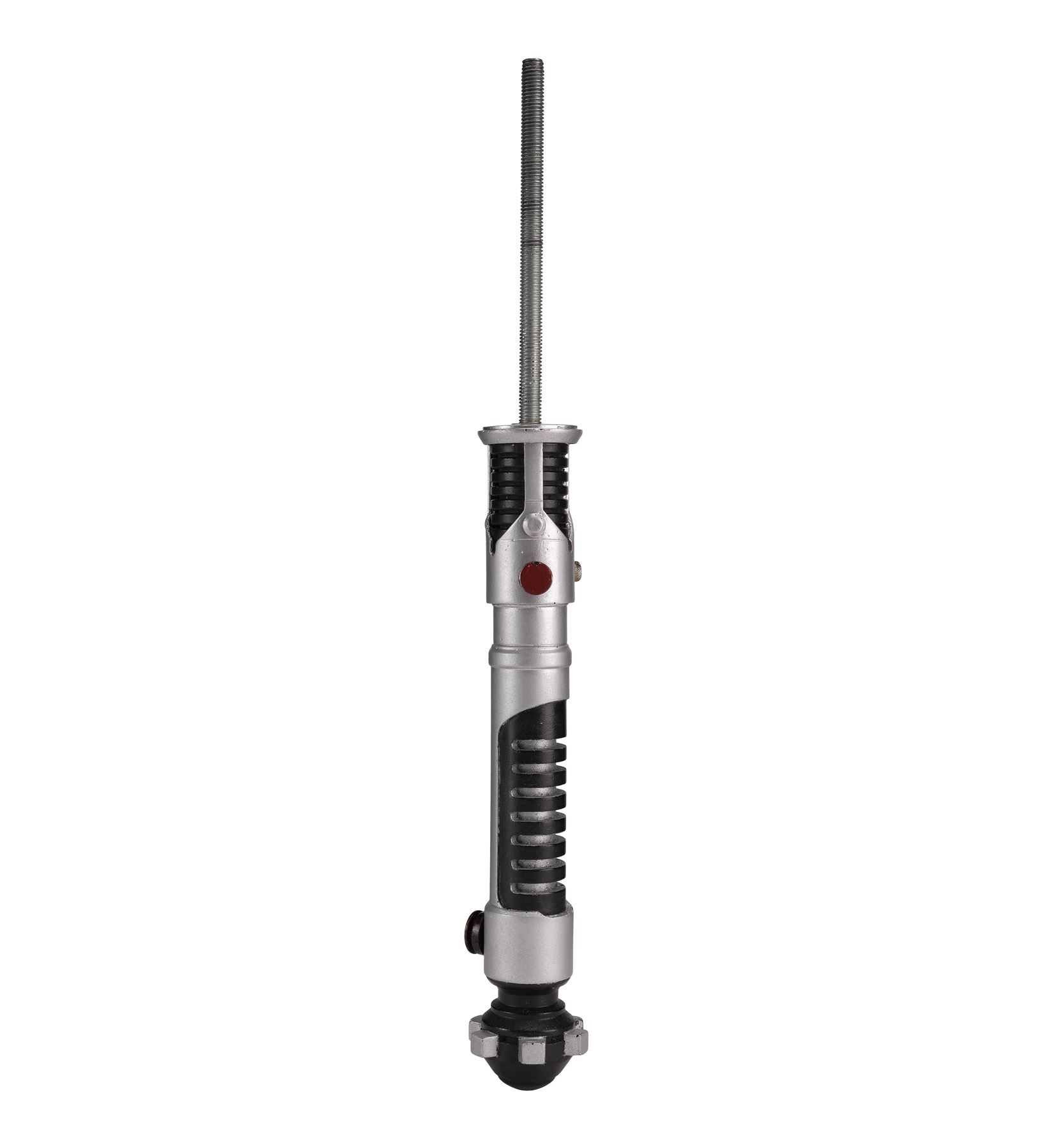 This lightsaber hilt features a ridged resin handgrip with a rounded pommel cap inset with a threaded steel rod and painted silver-color, black, and red to simulate a metallic finish. The threaded rod allowed for installation of aluminum blades that were used for dueling sequences and replaced frequently as they were damaged on set.