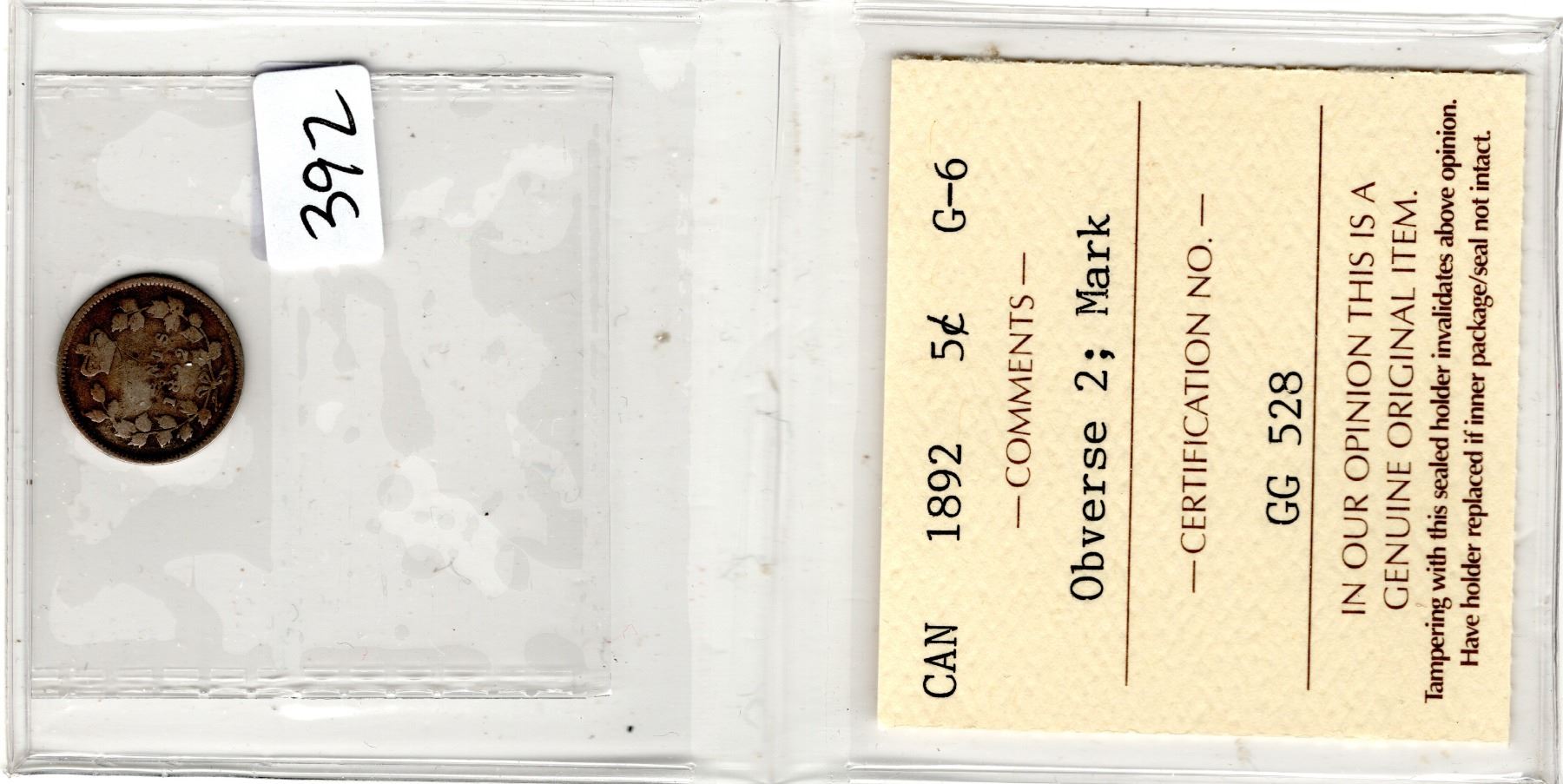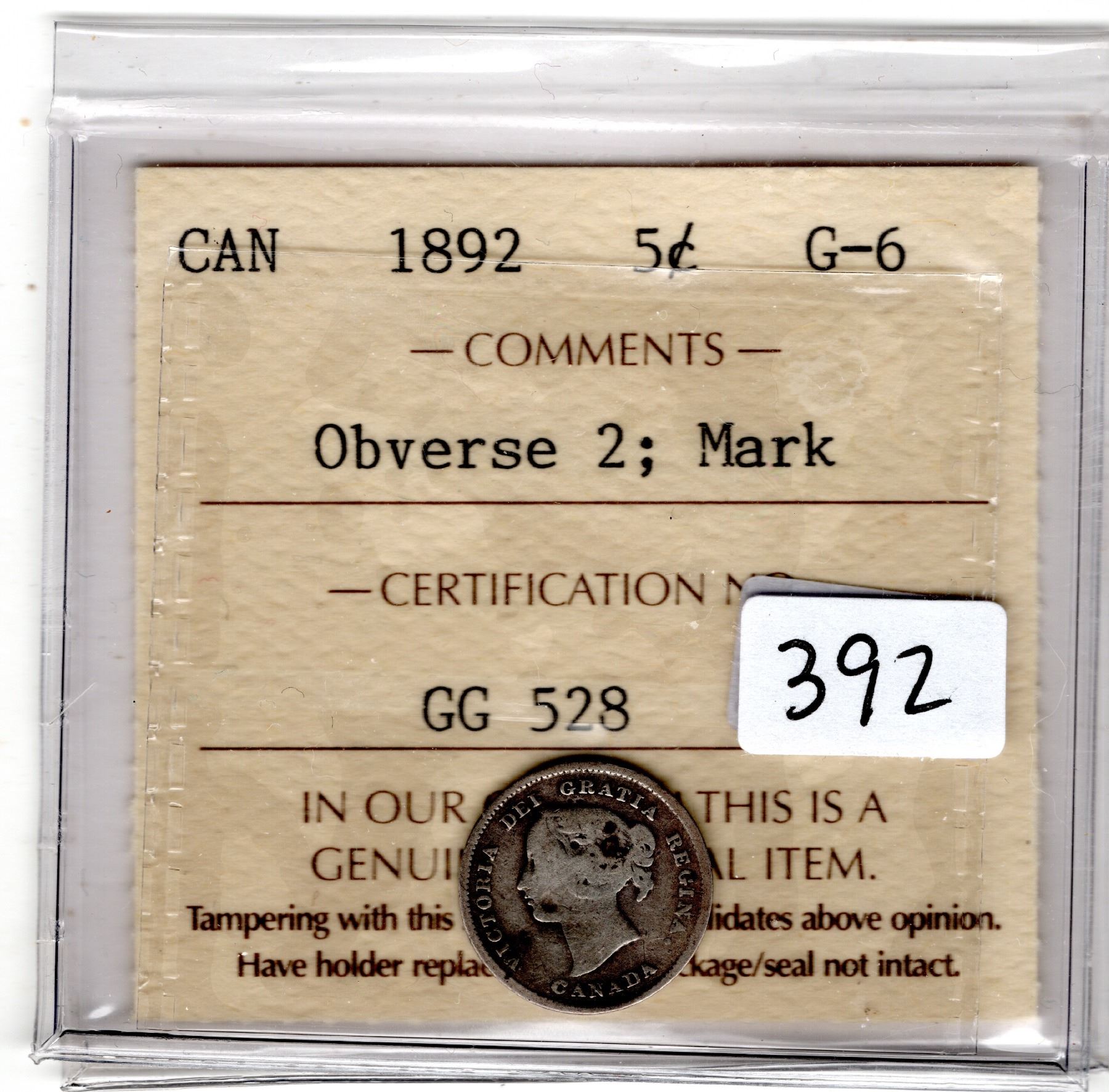 392. ICCS 1892 FIVE CENT OBVERSE 2 MARK G-6