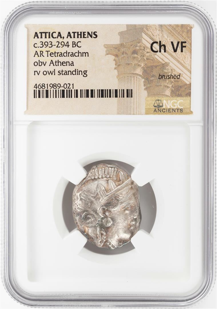 One 393-294 BC Attica Athens AR Tetradrachm Athena Owl Coin NGC CH VF. NGC Certified.