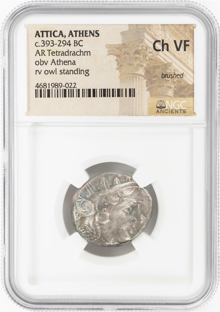 One 393-294 BC Attica Athens AR Tetradrachm Athena Owl Coin NGC CH VF. NGC Certified.