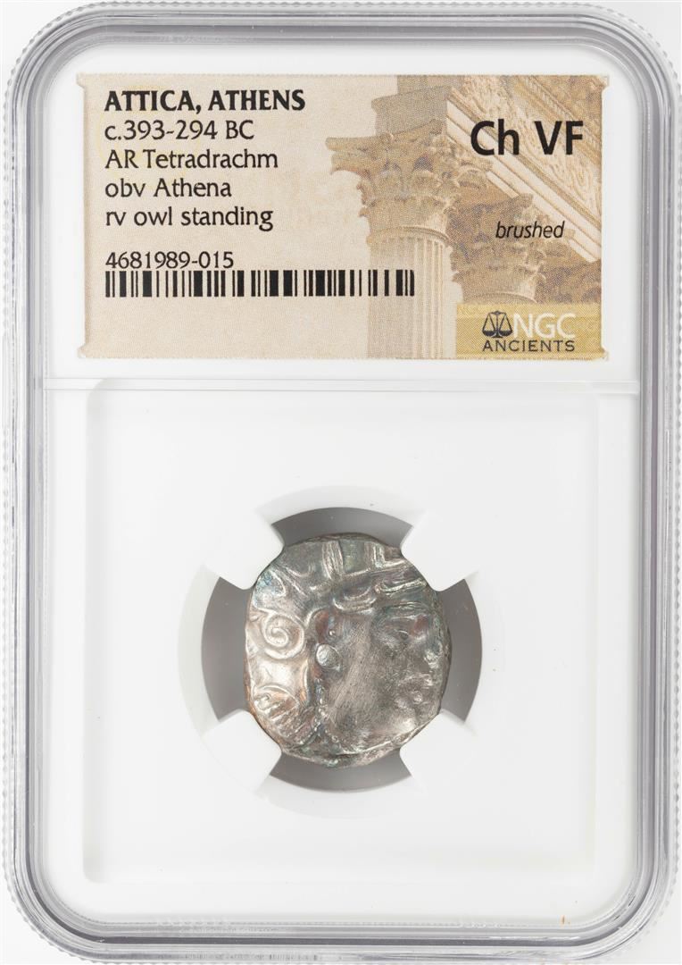 One 393-294 BC Attica Athens AR Tetradrachm Athena Owl Coin NGC CH VF. NGC Certified.