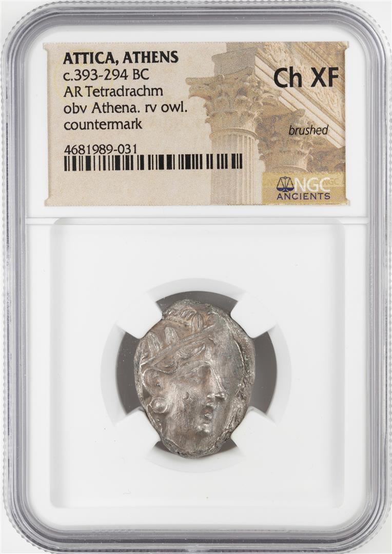 One 393-294 BC Attica Athens AR Tetradrachm Athena Owl Coin NGC CH XF. NGC Certified.