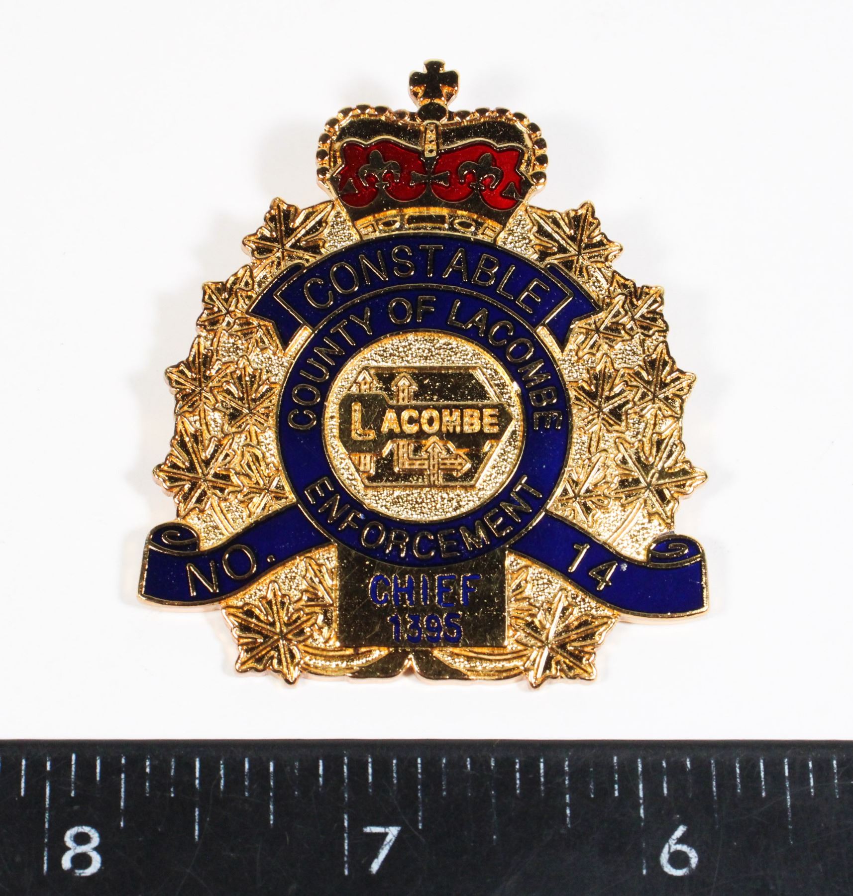 MAKER MARKED JUNIPER ON REVERSE CONSTABLE COUNTY OF LACOMBE ENFORCEMENT NO. 14 CHIEF VINTAGE CANADA CANADIAN POLICE LAW ENFORCEMENT CAP BADGE INSIGNIA
