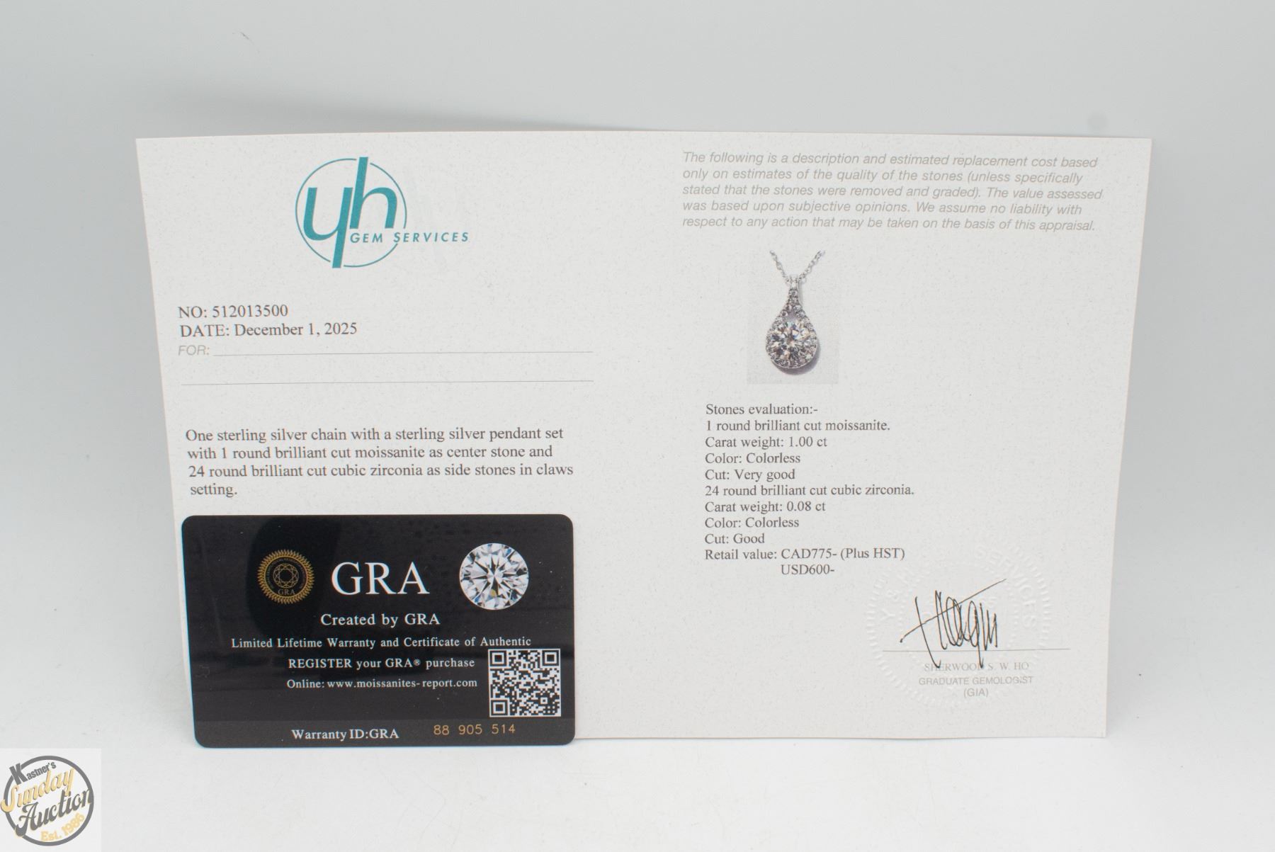 CUT MOISSANITE STONE VVS D COLOR WITH 24 ROUND BRILLIANT CUT CUBIC ZIRCONIA SET IN TEAR DROP HALO SET IN 925 SILVER PENDANT RETAIL VALUE $775.00 **ALL ITEMS MUST BE REMOVED BY 5PM SATURDAY, APRIL 4TH 2026. ALL REMAINING ITEMS WILL BE SUBJECT TO A $6.00 PER DAY STORAGE CHARGE. ANY ITEMS REMAINING AFTER MONDAY, APRIL 27TH 2026 WILL BE CONSIDERED FORFEITED. NO REFUNDS WILL BE ISSUED FOR FORFEITED ITEMS. TO SCHEDULE A PICK UP APPOINTMENT CLICK HERE