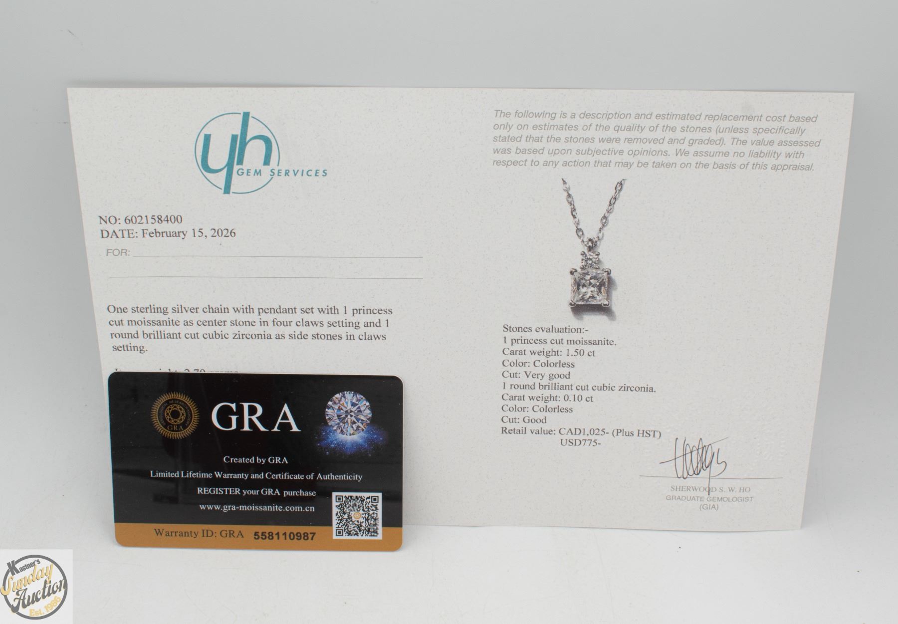 MOISSANITE STONE VVS D COLOR SET WITH SMALLER 0.10 ROUND BRILLIANT CUT CUBIC ZIRCONIA SET ABOVE SET IN 925 SILVER PENDANT RETAIL VALUE $1,025.00 **ALL ITEMS MUST BE REMOVED BY 5PM SATURDAY, MARCH 28TH 2026. ALL REMAINING ITEMS WILL BE SUBJECT TO A $6.00 PER DAY STORAGE CHARGE. ANY ITEMS REMAINING AFTER MONDAY, APRIL 20TH 2026 WILL BE CONSIDERED FORFEITED. NO REFUNDS WILL BE ISSUED FOR FORFEITED ITEMS. TO SCHEDULE A PICK UP APPOINTMENT CLICK HERE