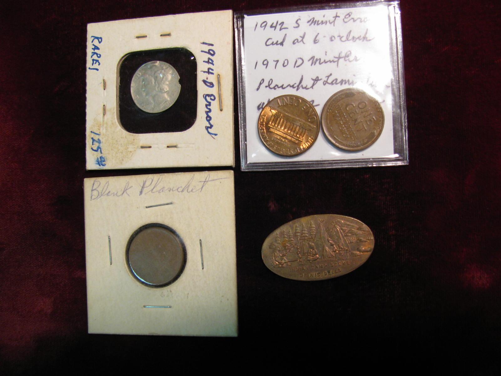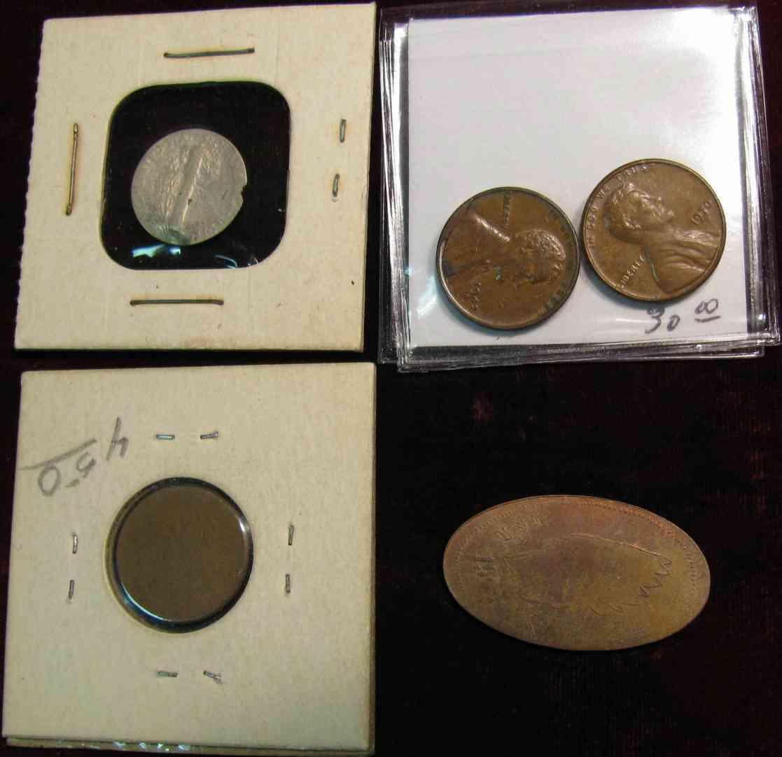 3986. (3) Lincoln Cent Errors; Wisconsin Dells Elongated Cent; & a thin planchet Mercury Dime error.