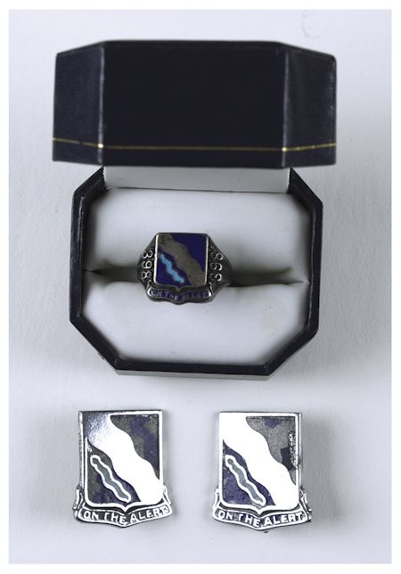 Vintage sterling silver ring with cloisonné inset emblem of the 398th Infantry Division and the division's motto "On the Alert", definitely a period piece. During World War II the 398th pushed through the Vosges from Marseilles, captured Bitche after a hard-fought battle, crossed the Rhine and drove into Germany, taking Odheim and occupying Stuttgart. Sold with two period collar or chest pins and the Aug. 23, 1945 edition of the regiment's newspaper. Along with five maps: the Battle of Bitche, The Battle of Vosges Mountain, The Battle for Heilbronn, "Operations of the 100th Infantry Division in the European Theater of Operation", and one titled "Finale".