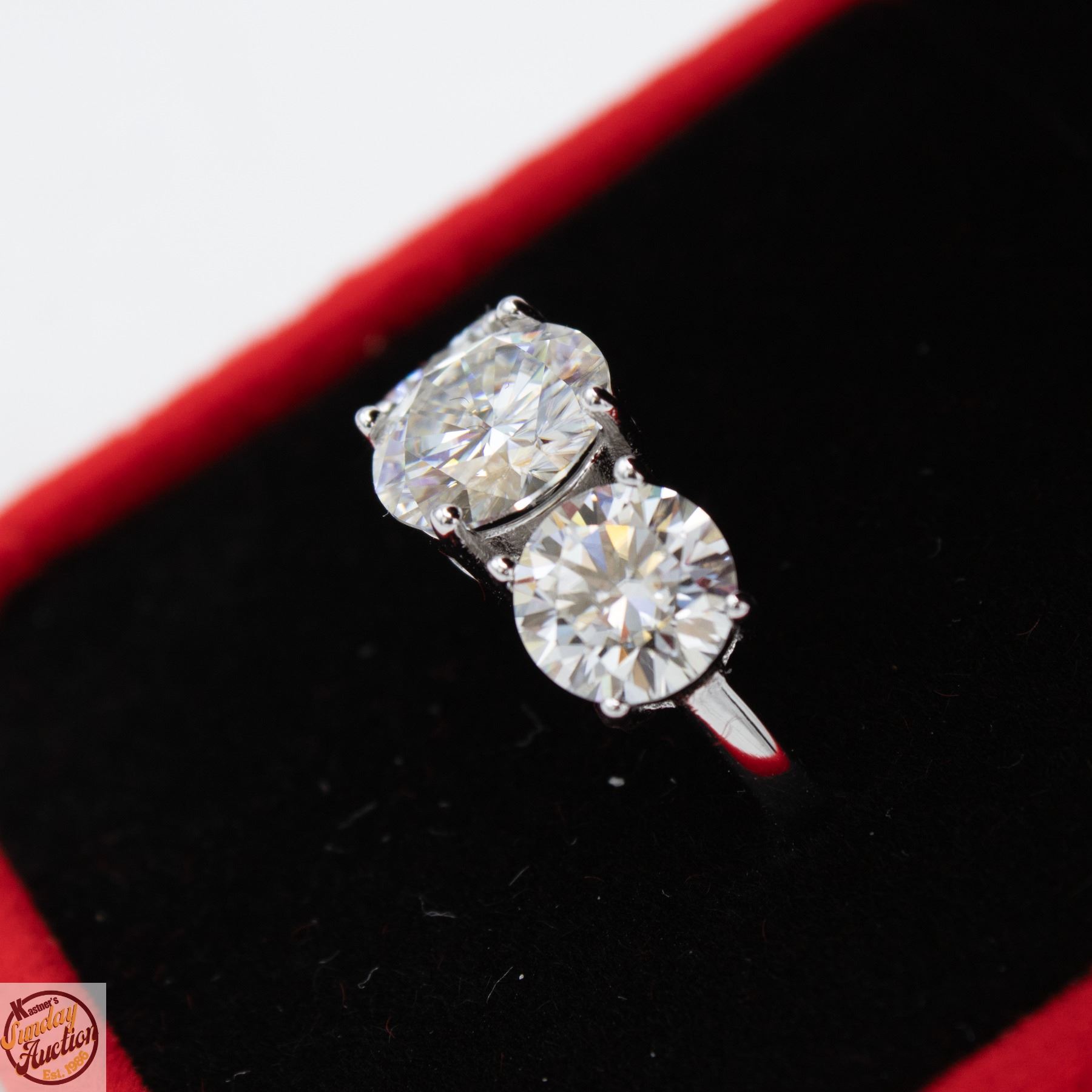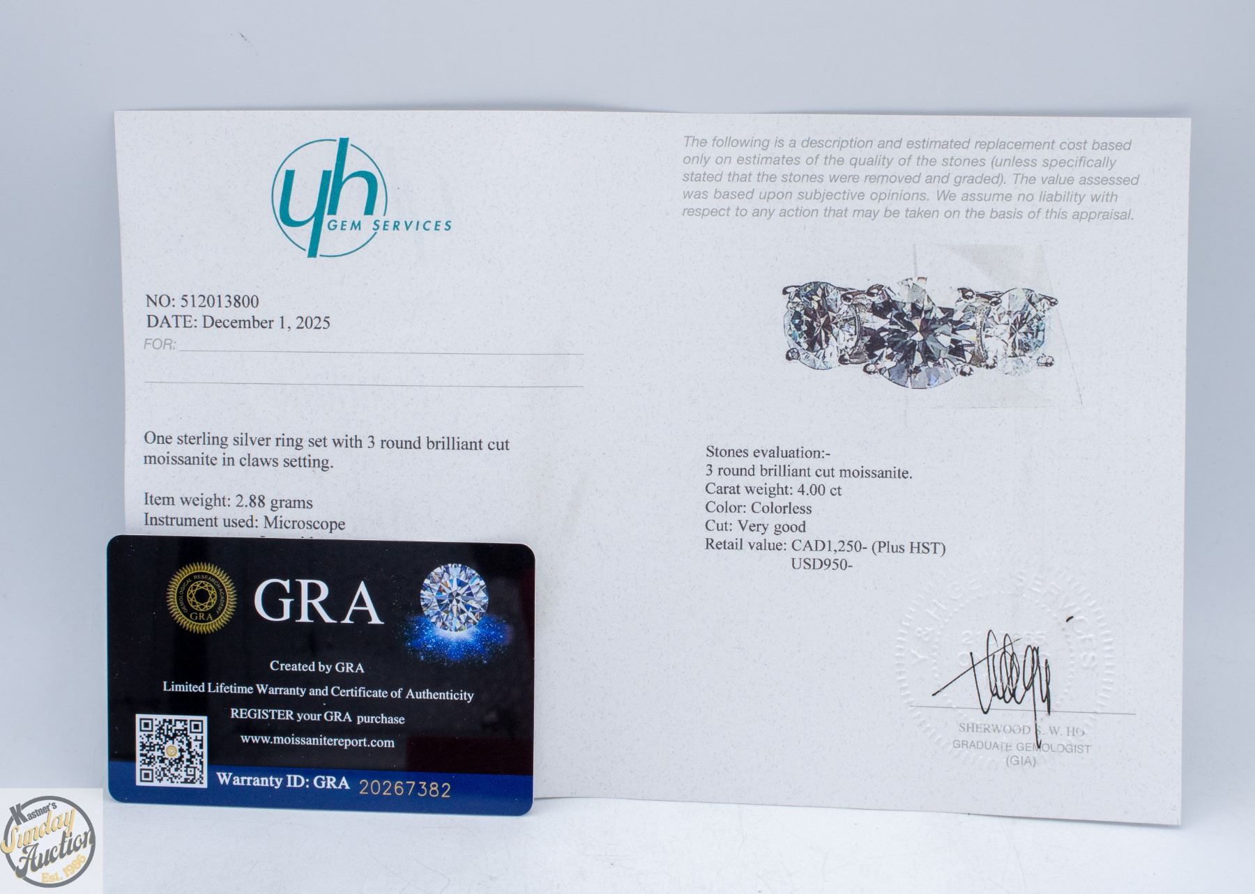 BRILLIANT CUT MOISSANITE STONES VVS D COLOR SET IN 3 ACROSS WITH 2.00 CT IN CENTER WITH 1.00 CT ON EITHER SIDE SET IN 925 SILVER RING SIZE 7 RETAIL VALUE $975.00 **ALL ITEMS MUST BE REMOVED BY 5PM SATURDAY, MARCH 28TH 2026. ALL REMAINING ITEMS WILL BE SUBJECT TO A $6.00 PER DAY STORAGE CHARGE. ANY ITEMS REMAINING AFTER MONDAY, APRIL 20TH 2026 WILL BE CONSIDERED FORFEITED. NO REFUNDS WILL BE ISSUED FOR FORFEITED ITEMS. TO SCHEDULE A PICK UP APPOINTMENT CLICK HERE
