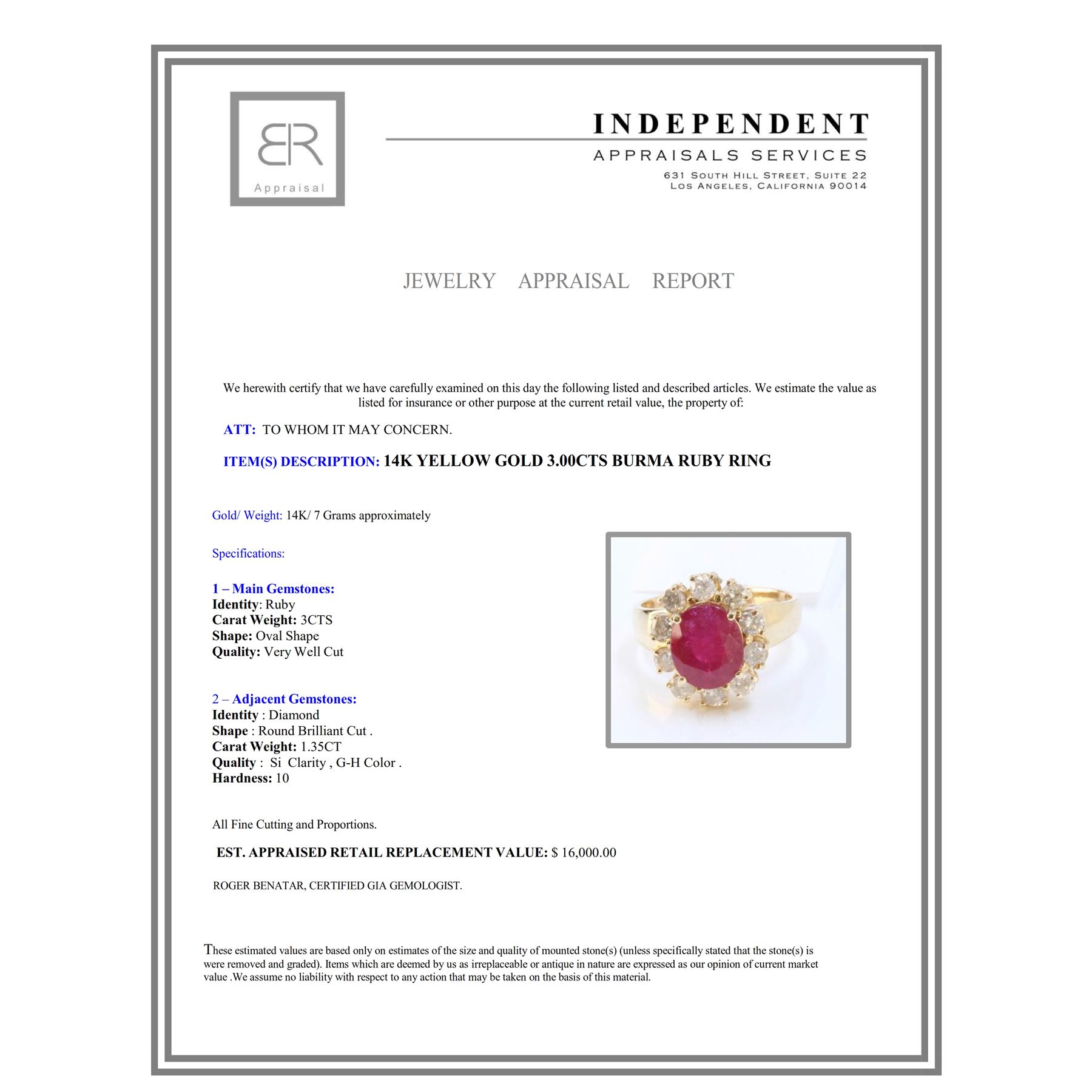 14K YELLOW GOLD NATURAL RUBY RING 7 GRAM APPROX/DIAMOND:1.35CT/RUBY:3CT/#GVR1048/ NO LEAD OR GLASS FILLING **Warmly crafted in 14K gold, this ravishing 3ct oval shape Ruby demands full attention. A gemstone of novelty and adventure, it is ensconsed with a halo of twinkling 1.35ct round brilliant cut Diamonds, of which delightfully brightens the hue and captures the eye.**