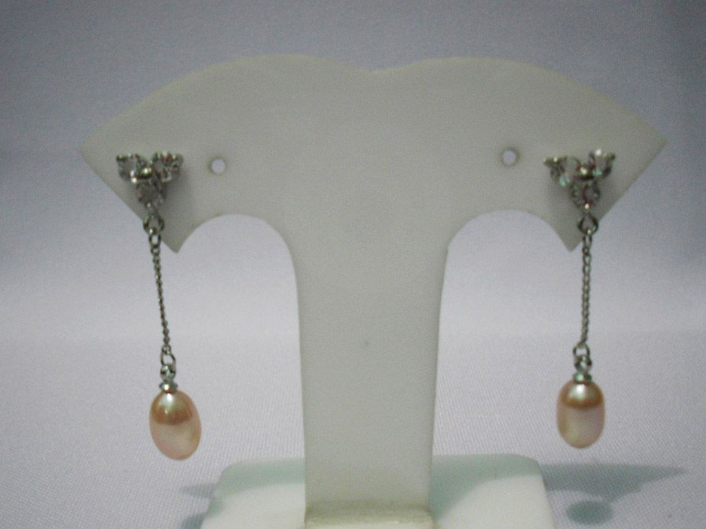 3CZ DANGLING TEARDROP PEACH PEARL EARRINGS **|**|** 3CZ DANGLING TEARDROP PEACH PEARL EARRINGS ; MSRP: $75