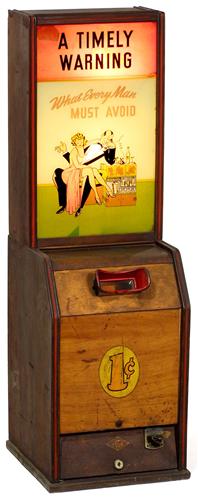 3D Counter Top Viewer "Exhibit Supply", c. 1930 "What every man must avoid". Wooden case with illuminated glass front (size 131/3 x 14 x 41 in.), complete but changed to continuous operation.<Br>