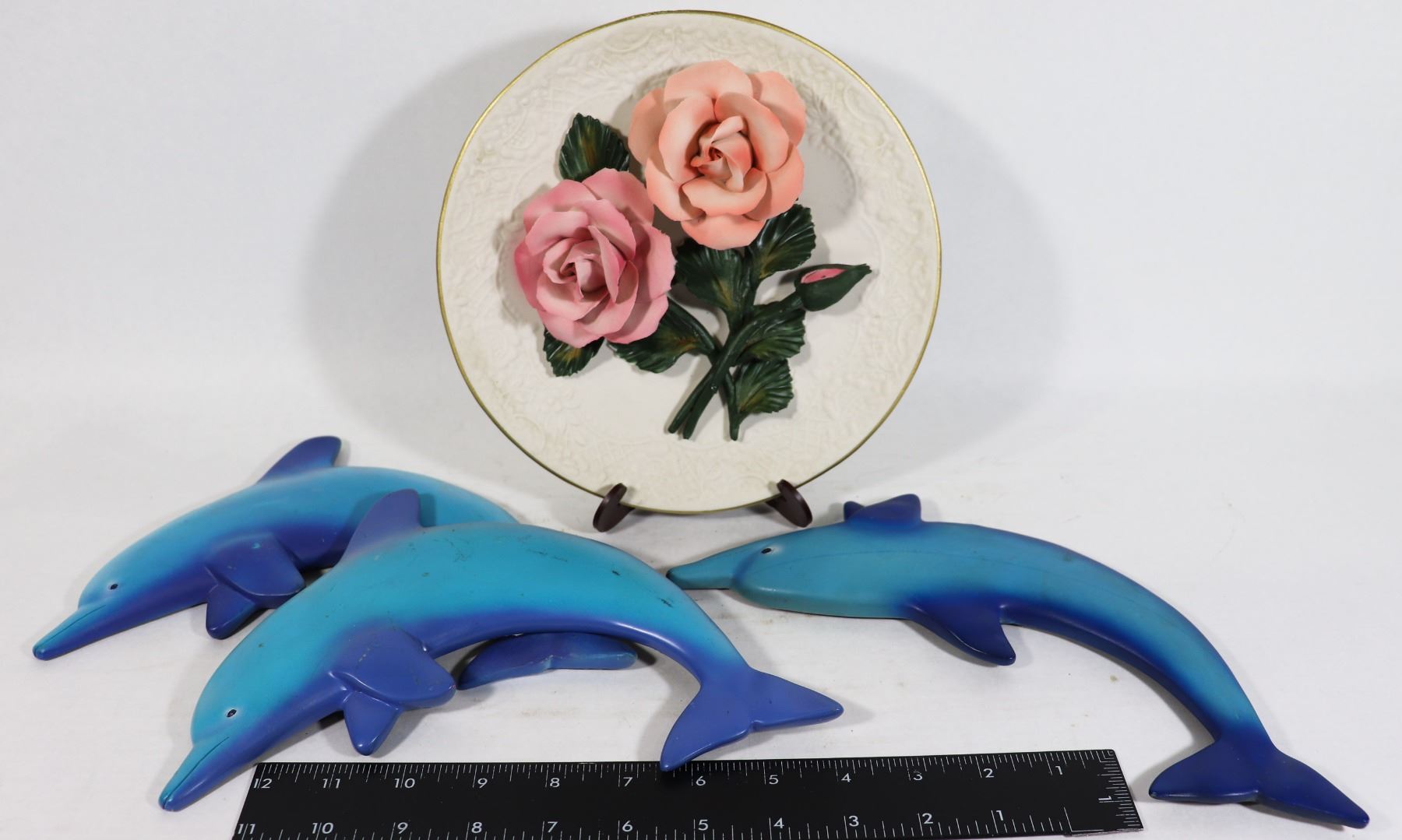 3D PINK ROSES ON A WHITE BACKGROUND. WOODEN DOLPHINS (3) INCLUDED.