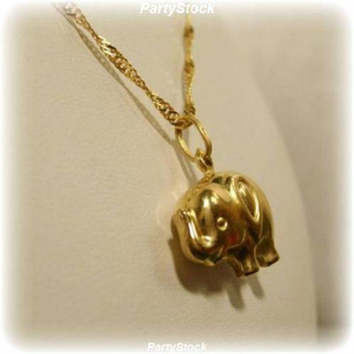 Solid 14 Karat Yellow Gold Necklace features our exquisite, 3D "Puffy" Elephant Pendant with raised trunk for luck! Pendant is 3D (or puffy), so it has no back or front....it looks the same from both sides! Nice and thick, like a little elephant statue. Gorgeous Singapore chain measures 18 Inches. Pendant measures 7/8 Inch square. Click on photos to enlarge and view the detail in this pendant. Exquisite!<P> Necklace weight: 4 Grams <p> This is a brand new item. <p> Please note: our merchandise is guaranteed 100% to your satisfaction. If you DON'T LOVE this item, simply return it for a complete refund of your purchase price. Our feedback is 100% positive, so you can shop with confidence, knowing that your satisfaction is our primary concern. <p> * Insurance is included in our shipping charges.