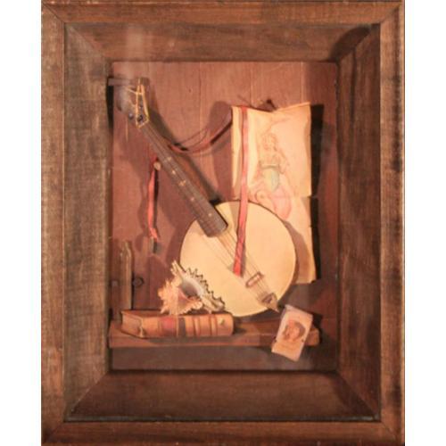 ?Shelf? is an incredibly unique creation by talented artist R.H. Redelins.  This unusual paper collage was handmade, created by taking multiple copies of the same print and layering them strategically to make the image appear to be three-dimensional.  In it we see a small shelf cluttered with an eclectic array of items.  A banjo is the largest of the items and amazing care was taken to bring the instrument into three dimensions, right down to the tiny strings suspended in space.   A drawing of a woman dancing is tacked to the wall behind the banjo and a shell sits atop a leather-bound book below it.  The print is mounted in a shadowbox frame of medium brown wood which brings the total measurements to 9? x 11.?  This is truly a one of a kind work of art that would be a charming and affordable addition to any collection.