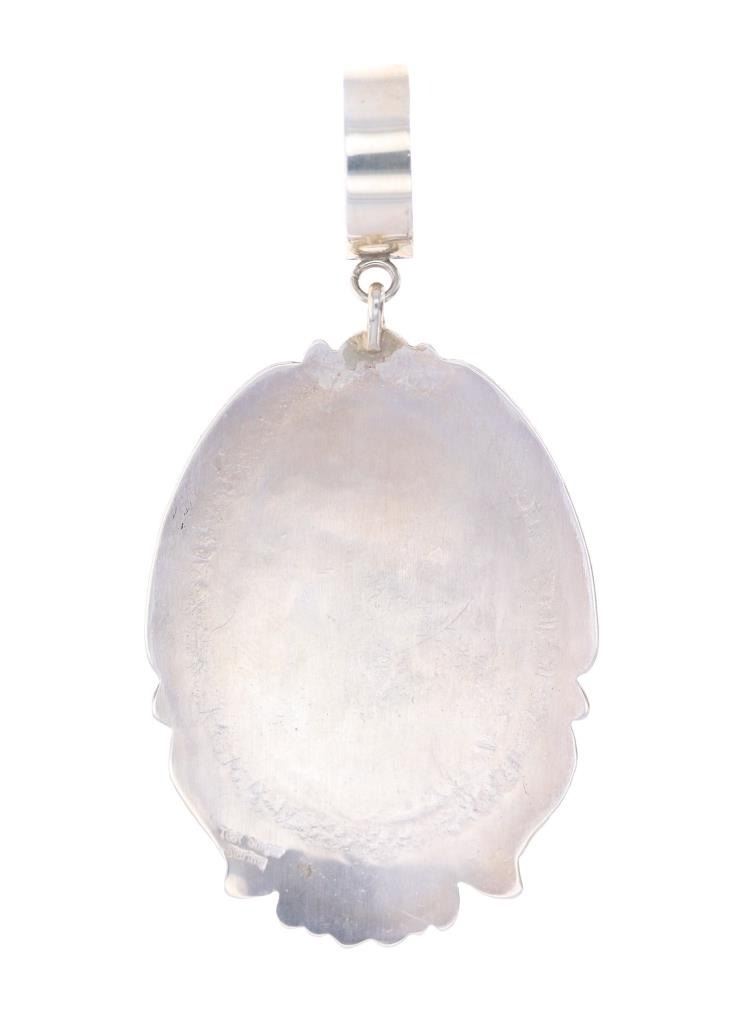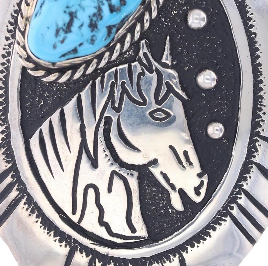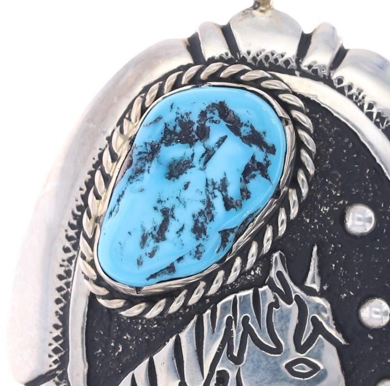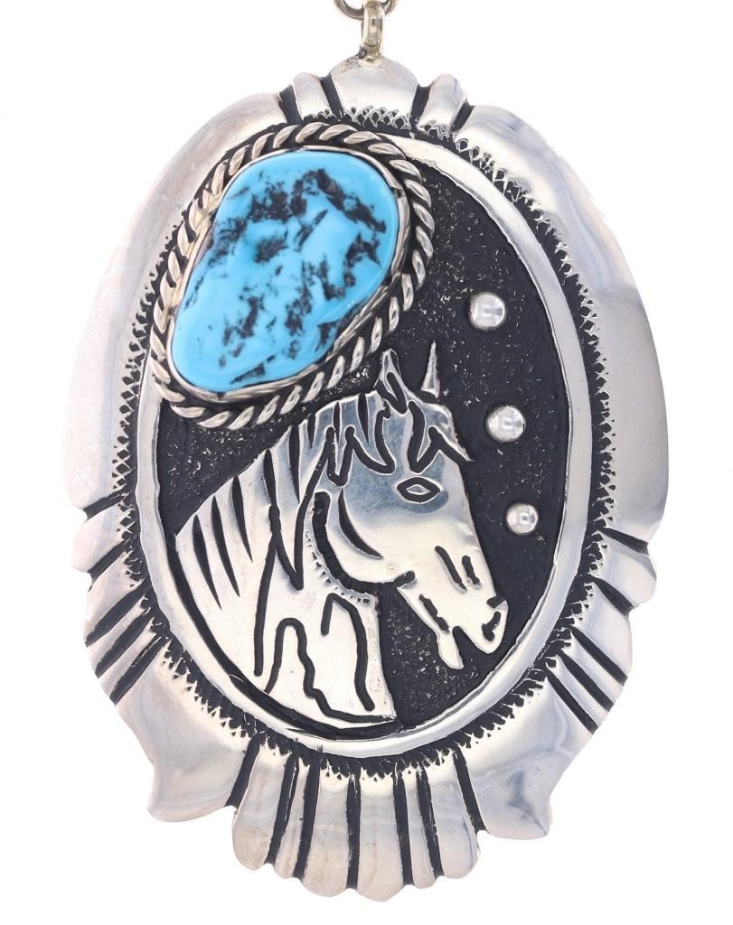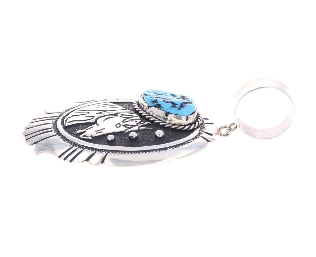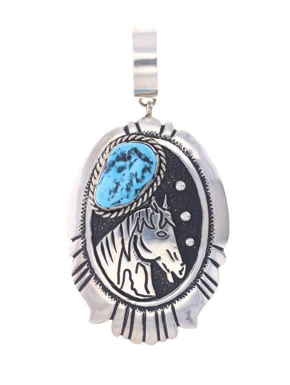 Featured in this lot is a sterling silver turquoise horse pendant from Navajo artists, Tommy and Rose Singer. The pendant features a wonderfully and professionally crafted sterling silver and turquoise construction that shows a horse head decoration with a nugget Sleeping Beauty Turquoise set above it. The pendant is marked on the back as follows: T & R Singer - Sterling. The overall condition of this Navajo pendant is good with no obvious signs of damage. The measurements of this pendant are 3 3/8" x 1 3/4" x 3/4". The collective weight of this pendant is 23.6g.*
