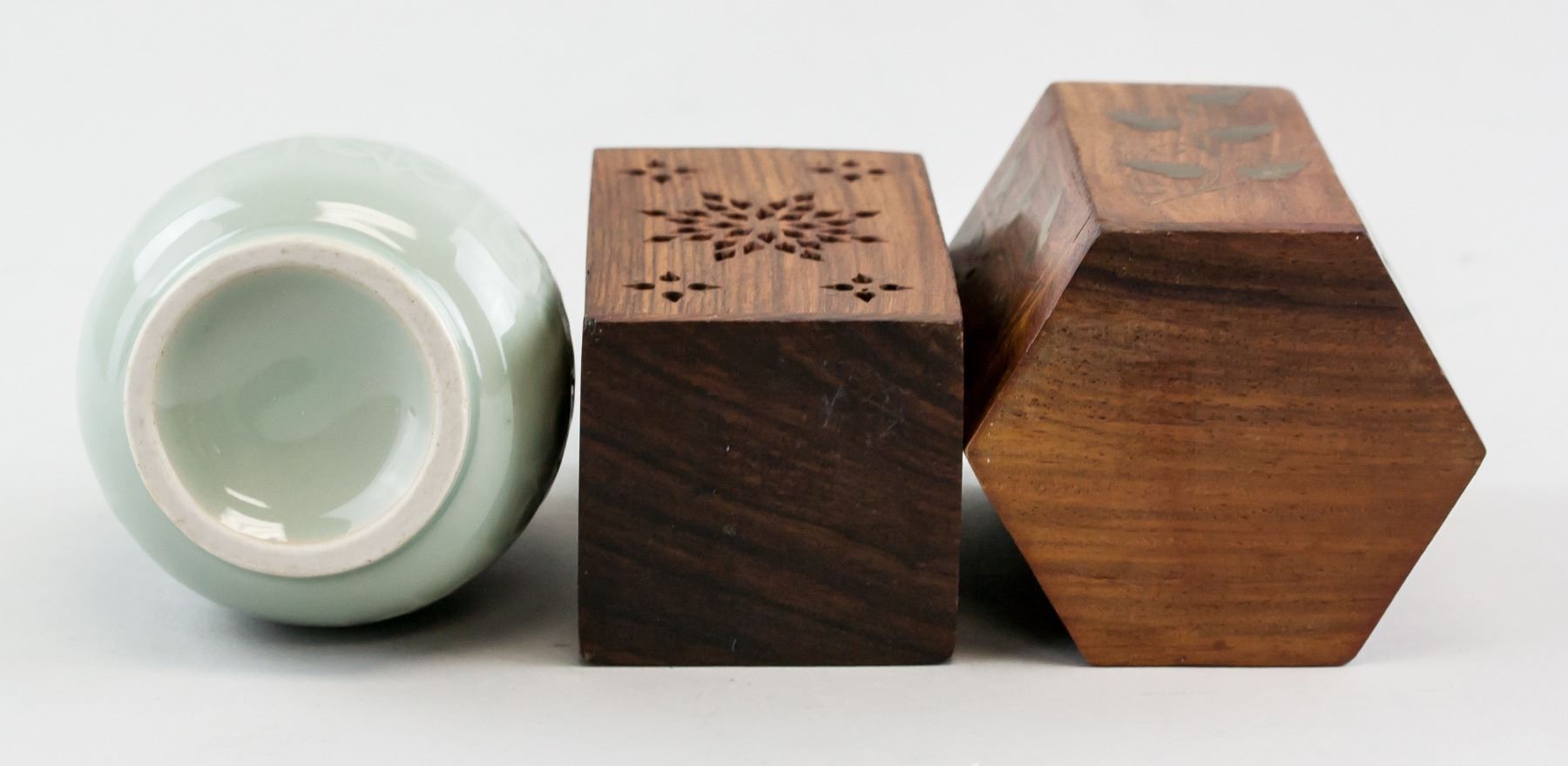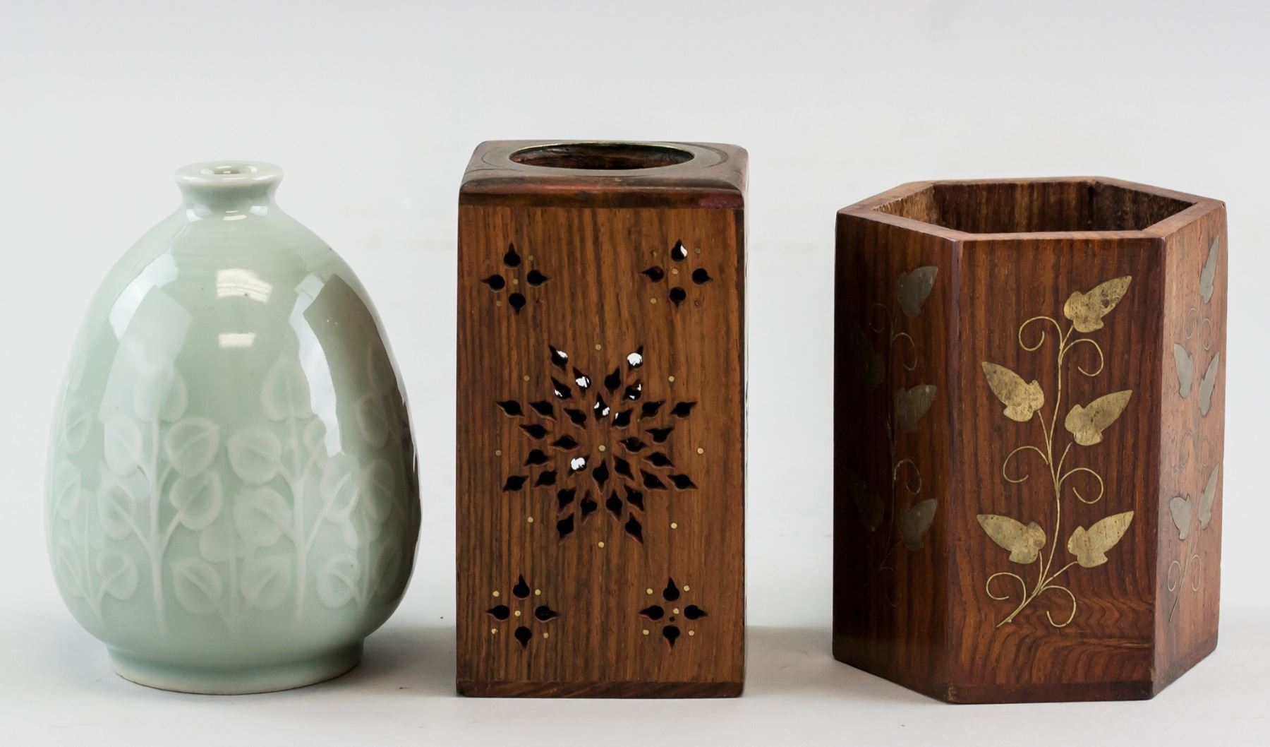 Three (3) assorted Chinese items. One green porcelain vase. Two wood carved brush pots. 9.5-10.5 x 6-7.5 cm, 447 grams (total)