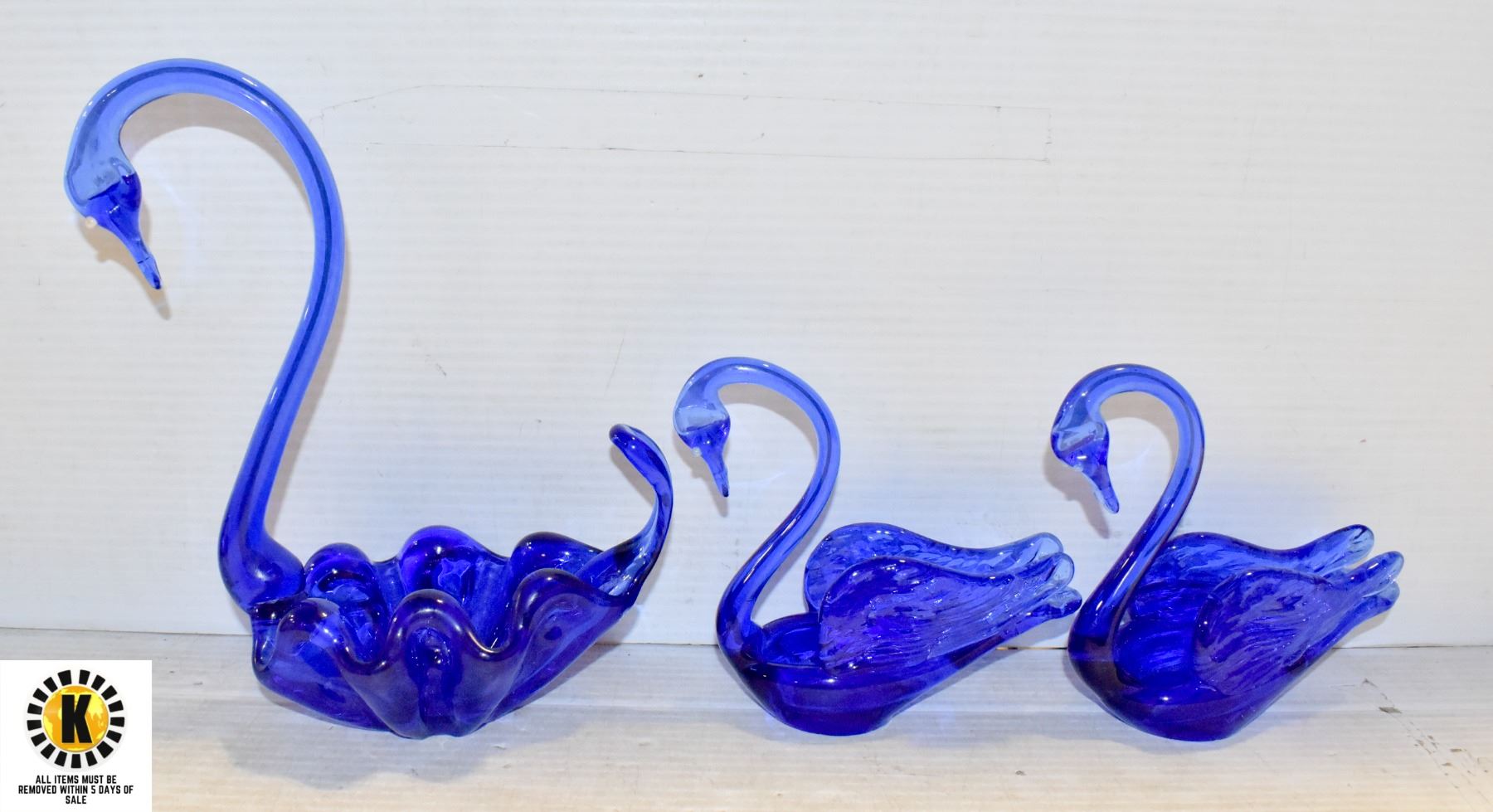 3PC BLUE ART GLASS SWANS THICK CHALET STYLE