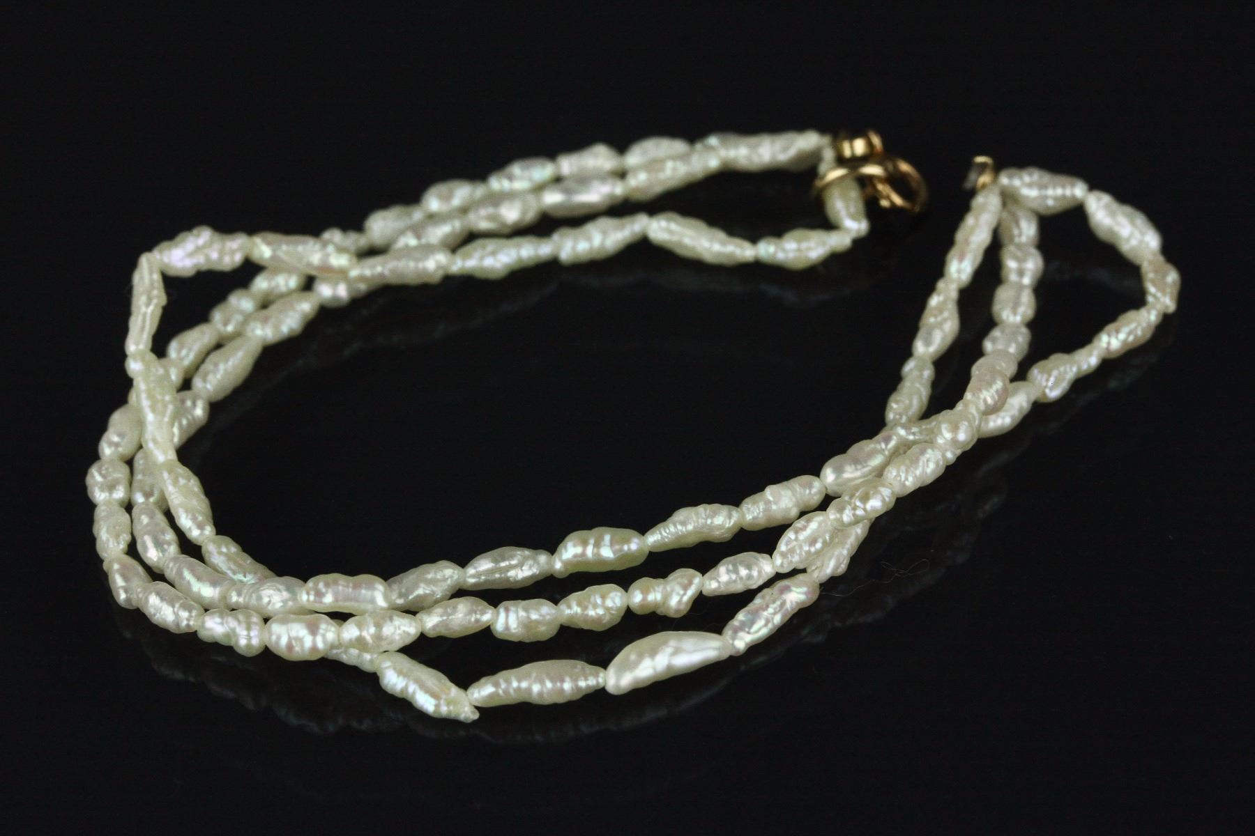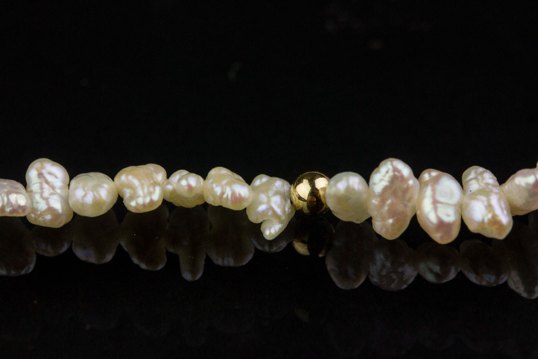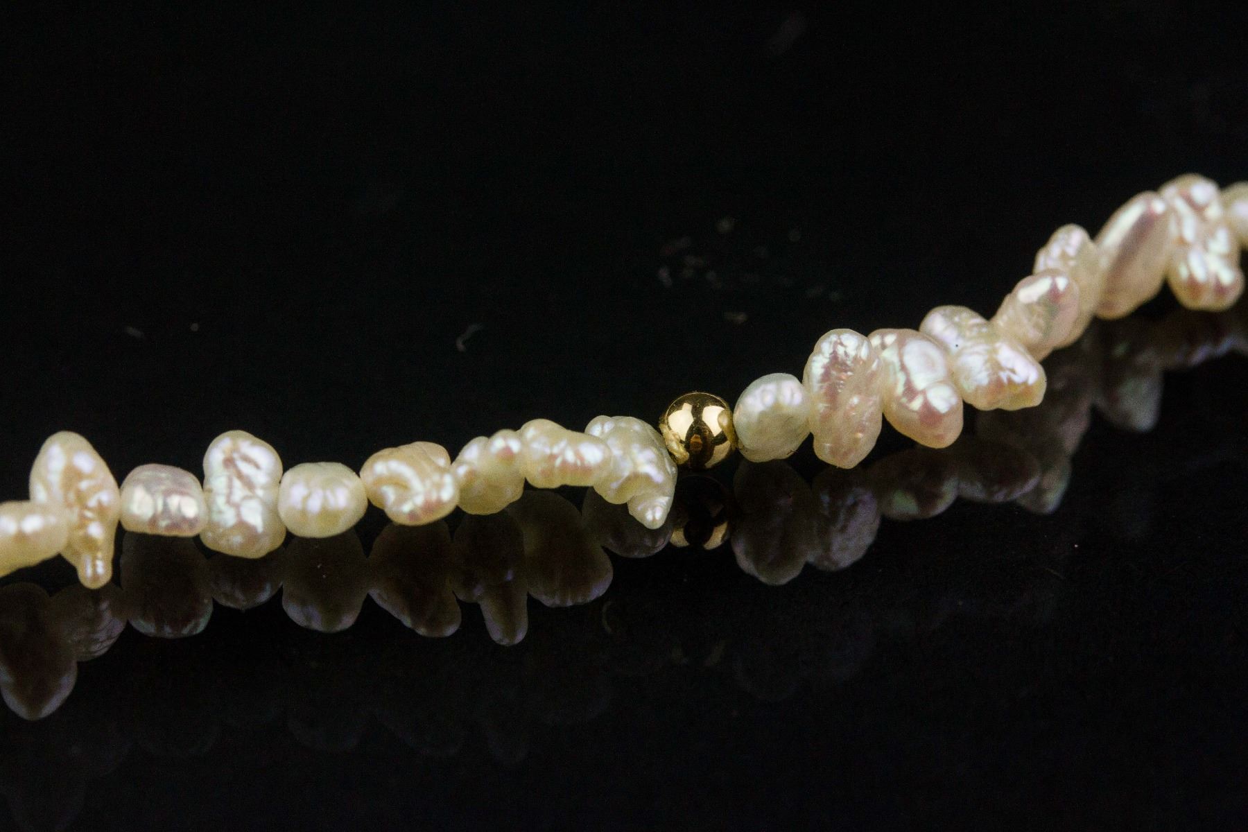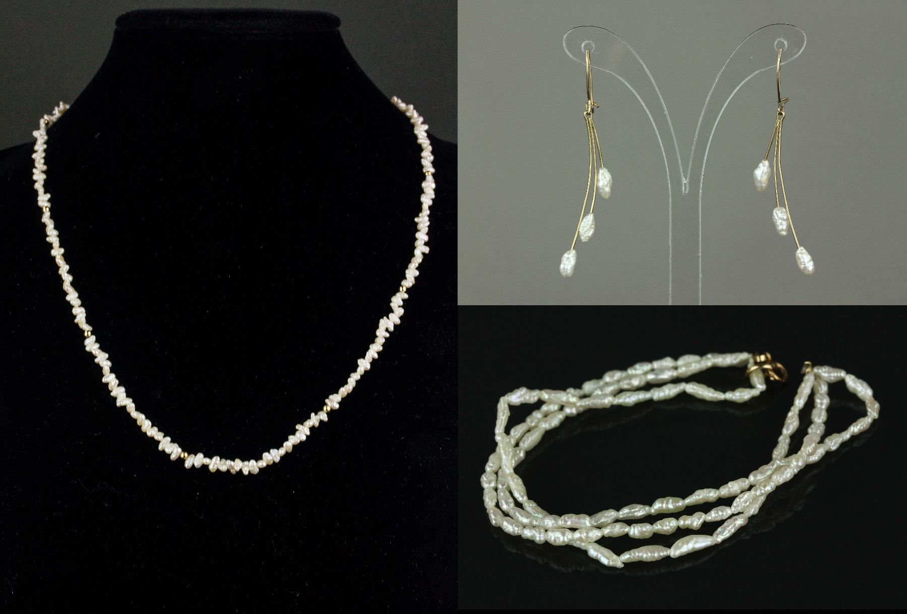 Three pieces of Chinese fine natural pearl jewellery; one necklace; comprised of numerous natural-shaped pearl beads and eight 14k gold beads; with 14k gold claps and jumping rings; one pair of earrings and a three-string bracelet; both with natural-shaped pearl beads; L: 28 cm, 5 grams; necklace: L: 60 cm, 9 grams