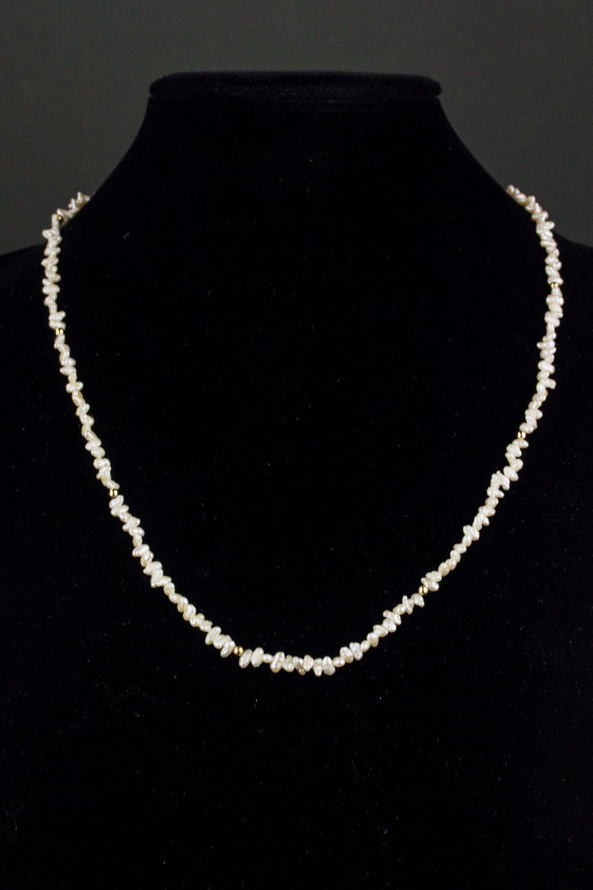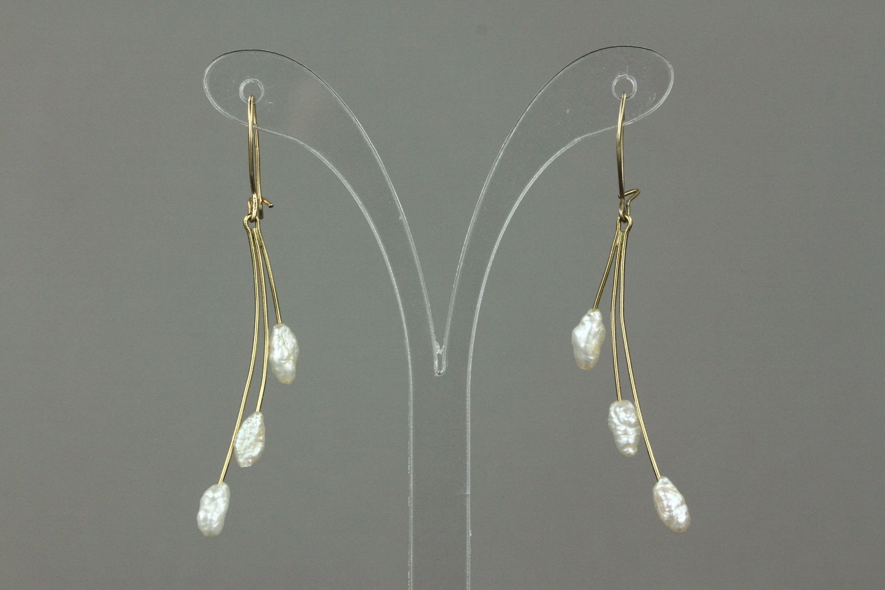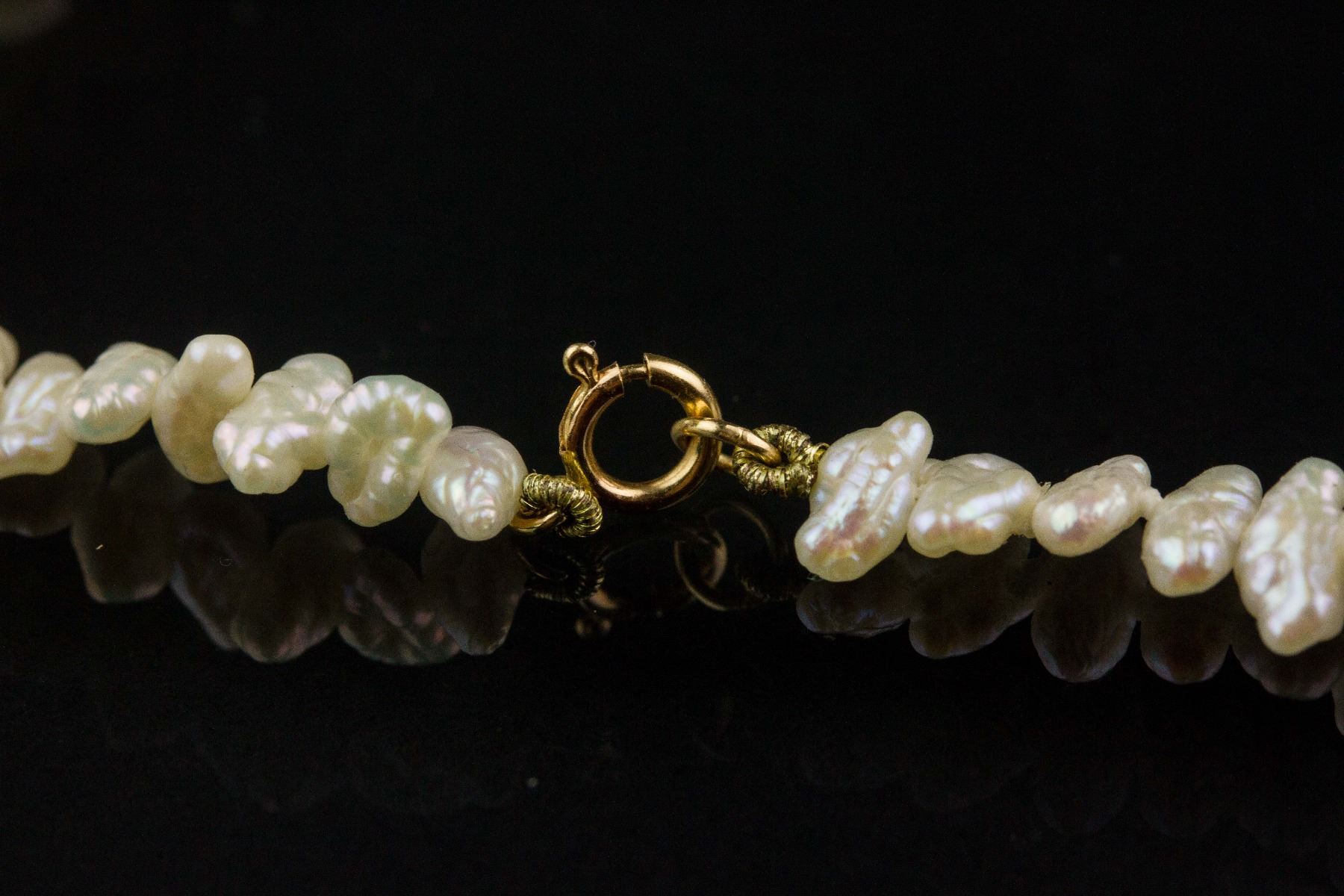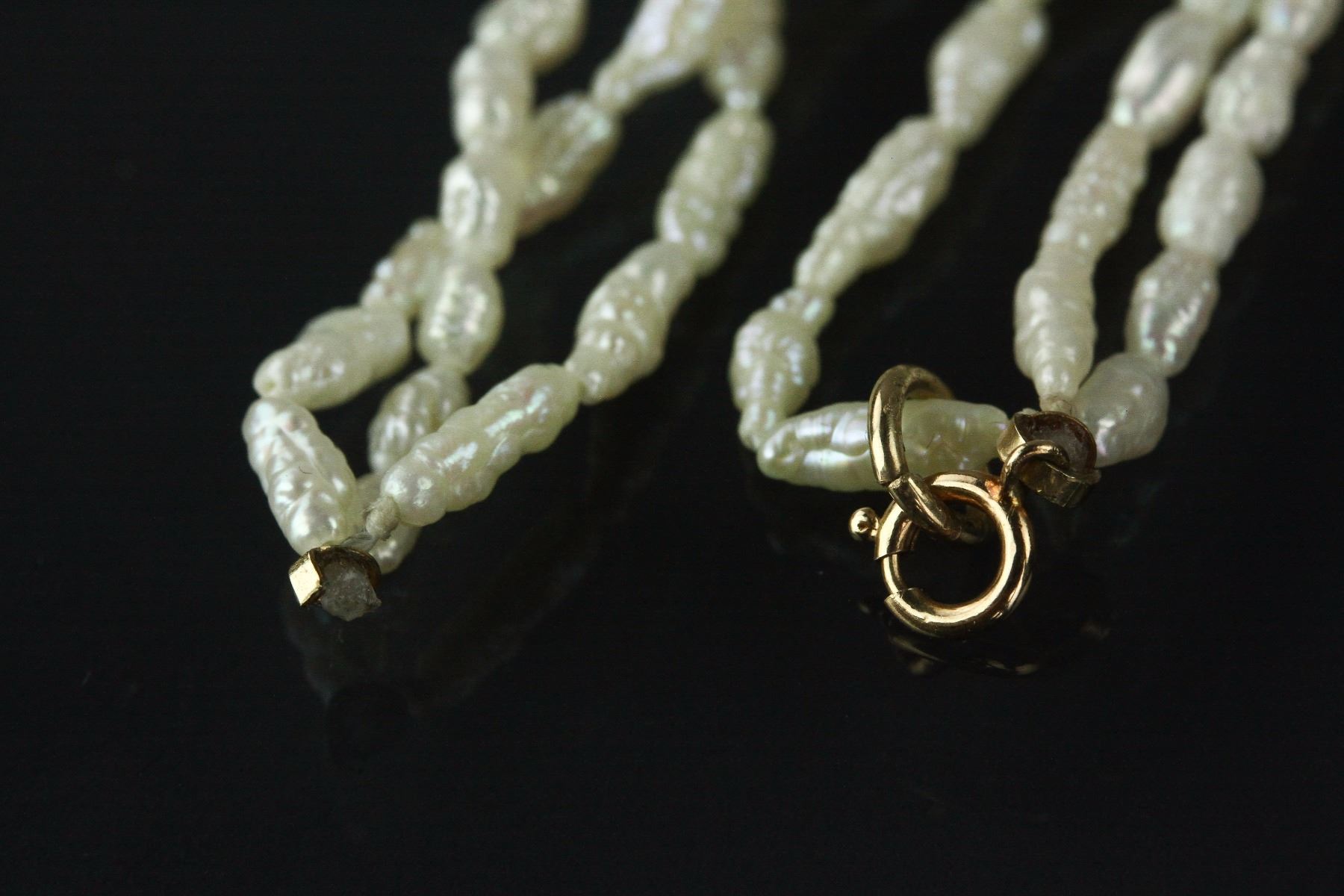 Three pieces of Chinese fine natural pearl jewellery; one necklace; comprised of numerous natural-shaped pearl beads and eight 14k gold beads; with 14k gold claps and jumping rings; one pair of earrings and a three-string bracelet; both with natural-shaped pearl beads; L: 28 cm, 5 grams; necklace: L: 60 cm, 9 grams