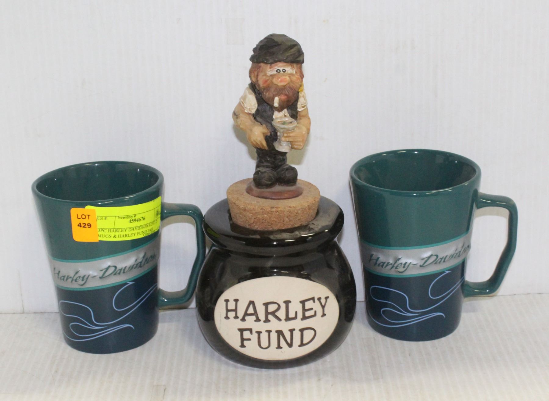 3PC HARLEY DAVIDSON LOT; 2 MUGS & HARLEY FUND JAR