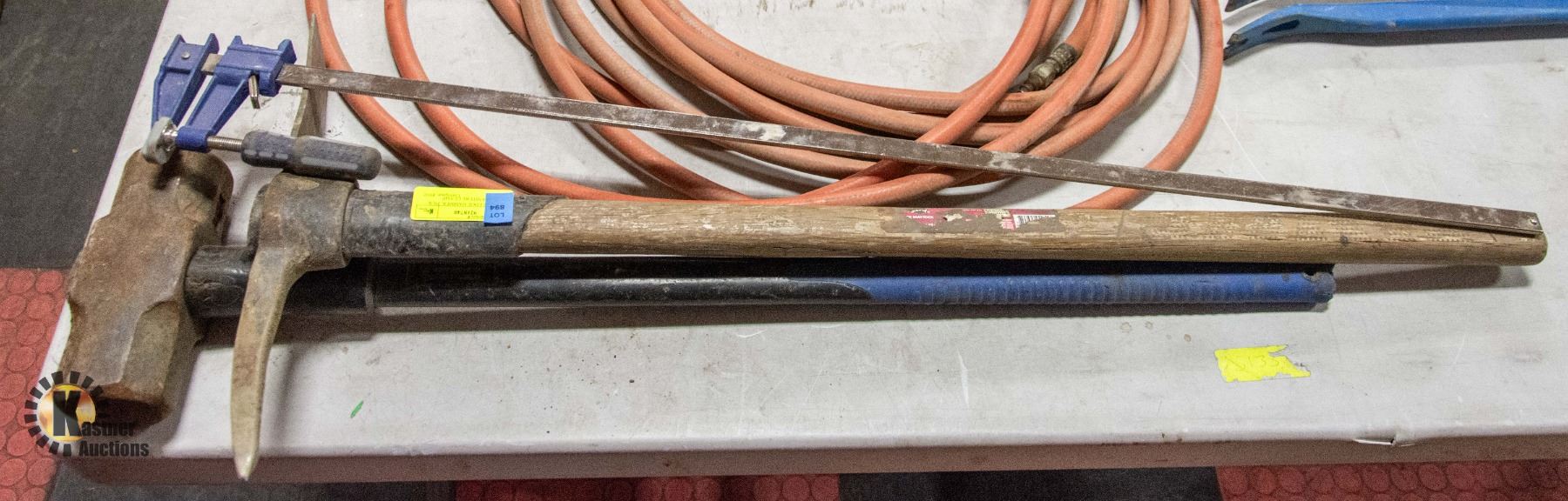 3PC LOT SLEDGE HAMMER, PICK AXE, & FURNITURE CLAMP